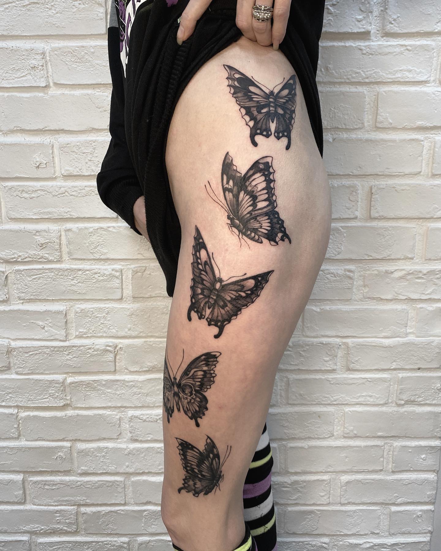 This striking tattoo features a collection of beautifully inked butterflies, each with unique details that make them stand out. Butterflies often symbolize transformation and freedom, making them a popular choice for thigh tattoos. When choosing a design, it’s essential to select something that resonates personally for a meaningful expression.