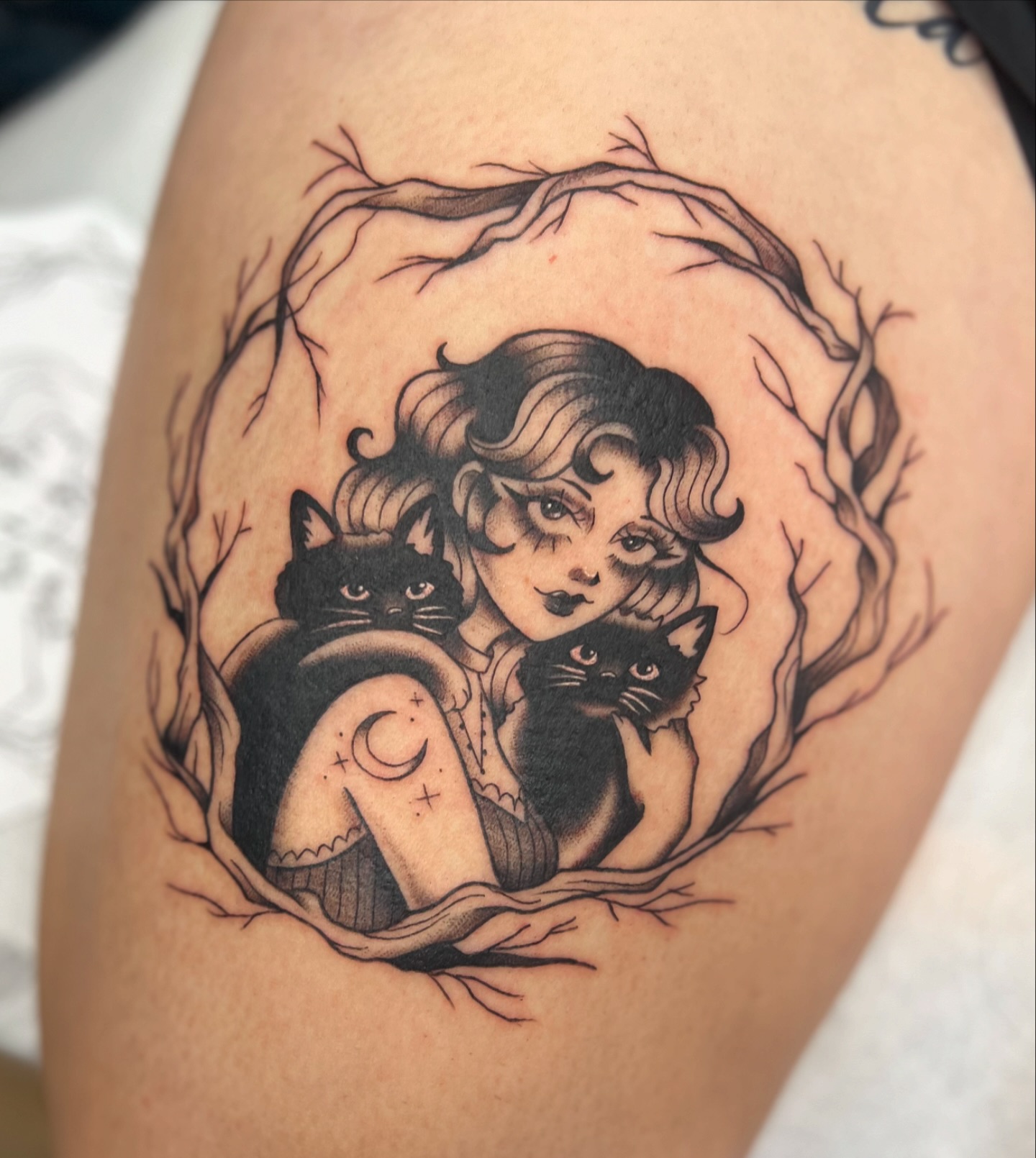 This captivating tattoo beautifully features a woman cradling two black cats within a delicate, branch-like frame. The intricate details and soft lines create a sense of warmth and connection between the figure and her feline friends. For those considering a thigh tattoo, choosing a design that reflects personal passions can make it truly special.