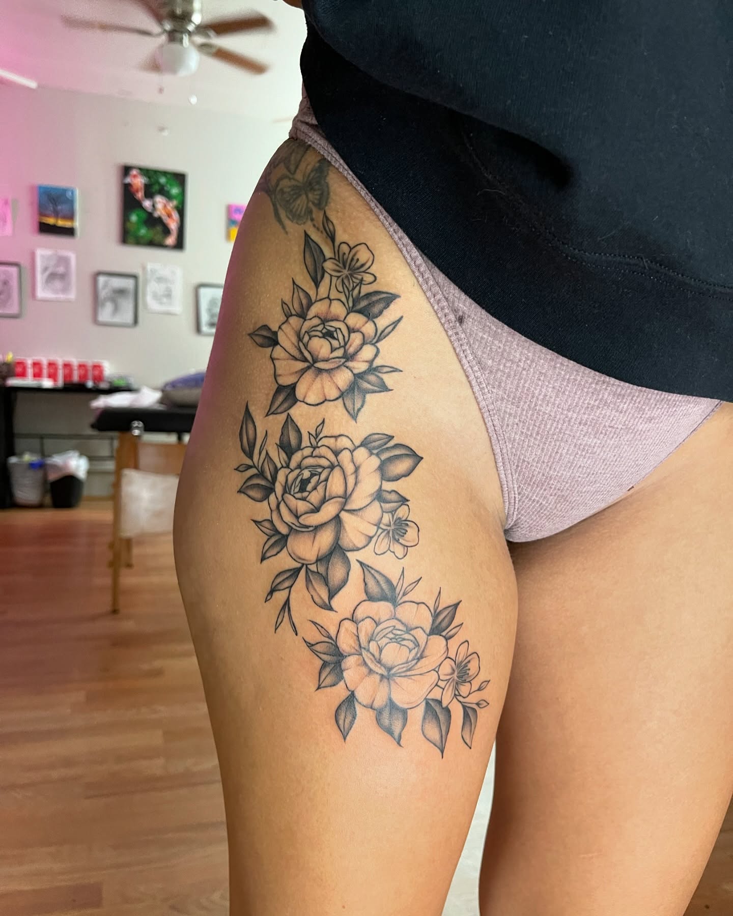 This stunning tattoo showcases beautiful flowers that elegantly drape across the thigh, creating a striking visual appeal. The intricate details and soft lines make it a remarkable piece of body art that tells a story of beauty and grace. When choosing a design, consider personal meanings behind the flowers to make the tattoo even more special.