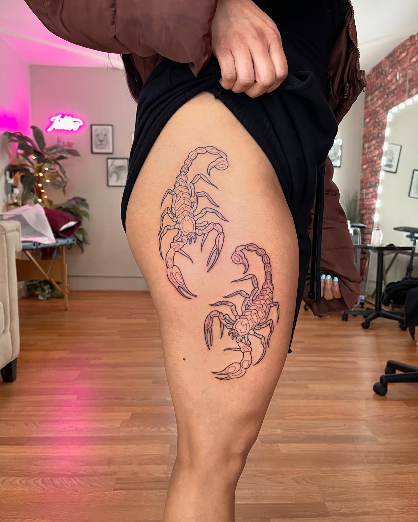 This striking tattoo showcases two beautifully detailed scorpions, each with its own unique flair. Scorpions often represent strength and resilience, making this design not just visually appealing but also meaningful. Choosing a thigh tattoo can be a bold way to express one’s personality and values while also embracing body art’s artistic nature.