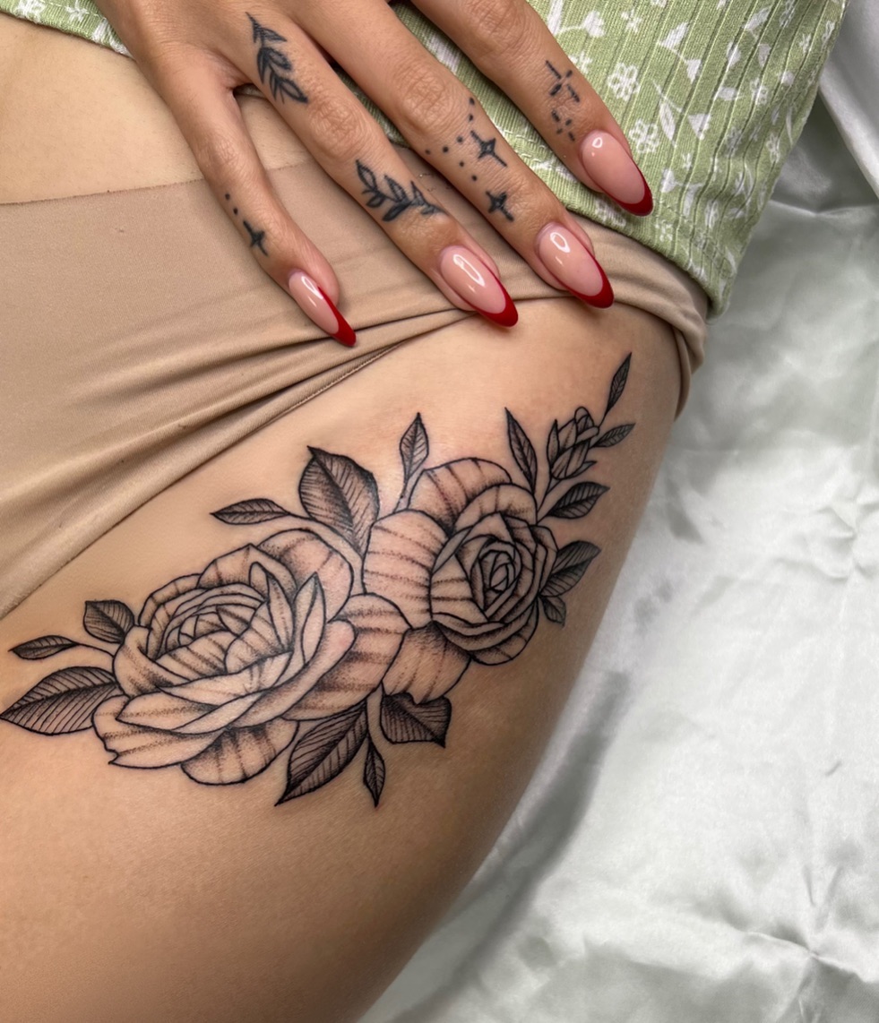 This stunning tattoo features beautiful roses and delicate leaves, creating a striking visual on the thigh. The intricate details bring the flowers to life, making it a perfect blend of elegance and personal expression. When choosing a thigh tattoo, consider designs that resonate with your personality and style for a truly unique piece.