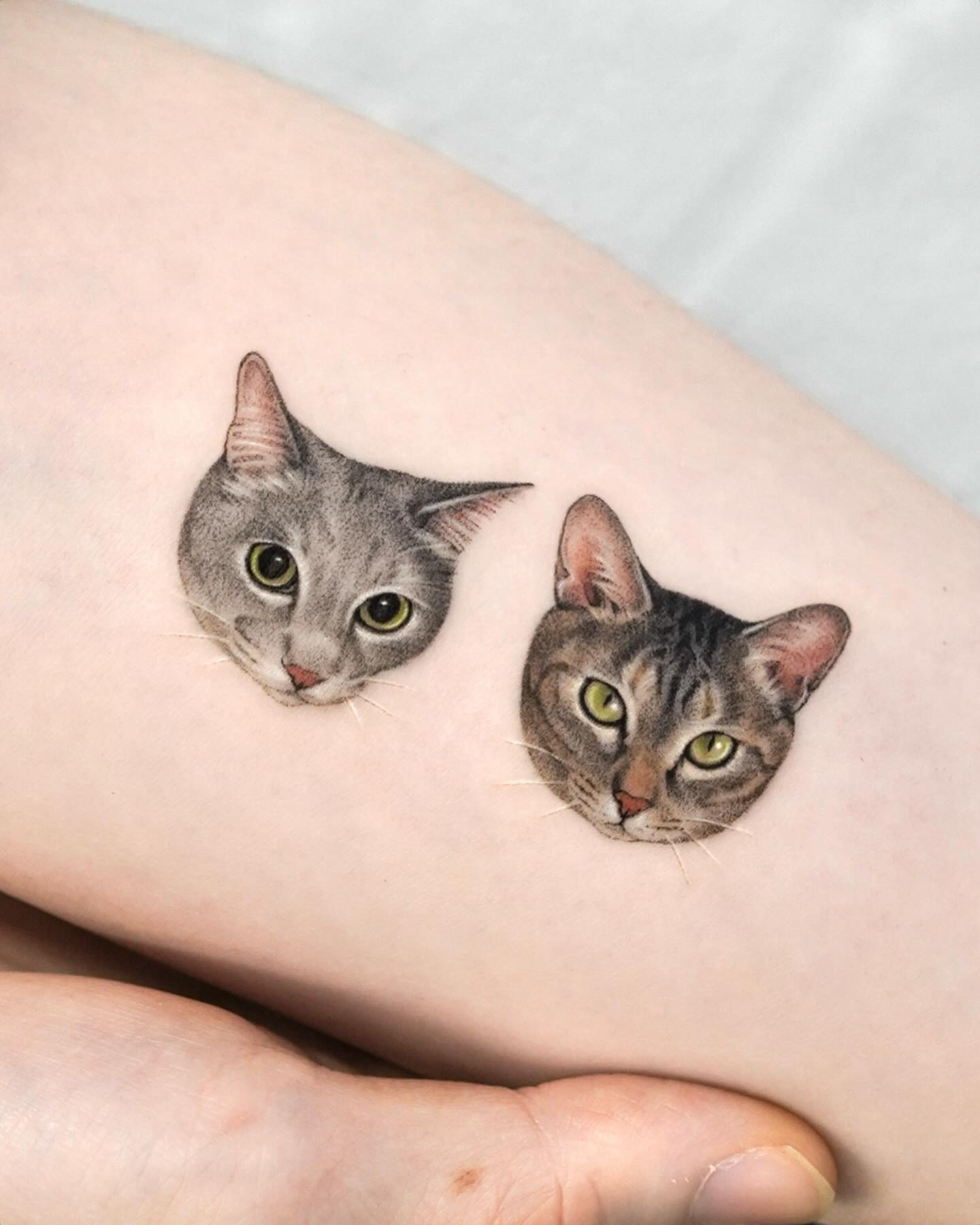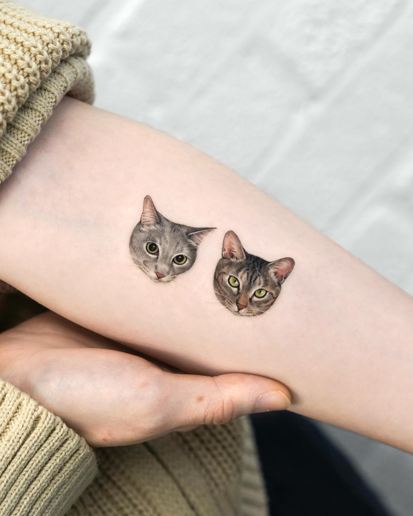 This image showcases two adorable cat faces intricately tattooed on an arm, capturing their unique expressions perfectly. Each detail, from the shiny eyes to the delicate fur, tells a story of the love for these furry companions. For cat lovers, such small tattoos can be a wonderful way to celebrate their bond with these playful pets.