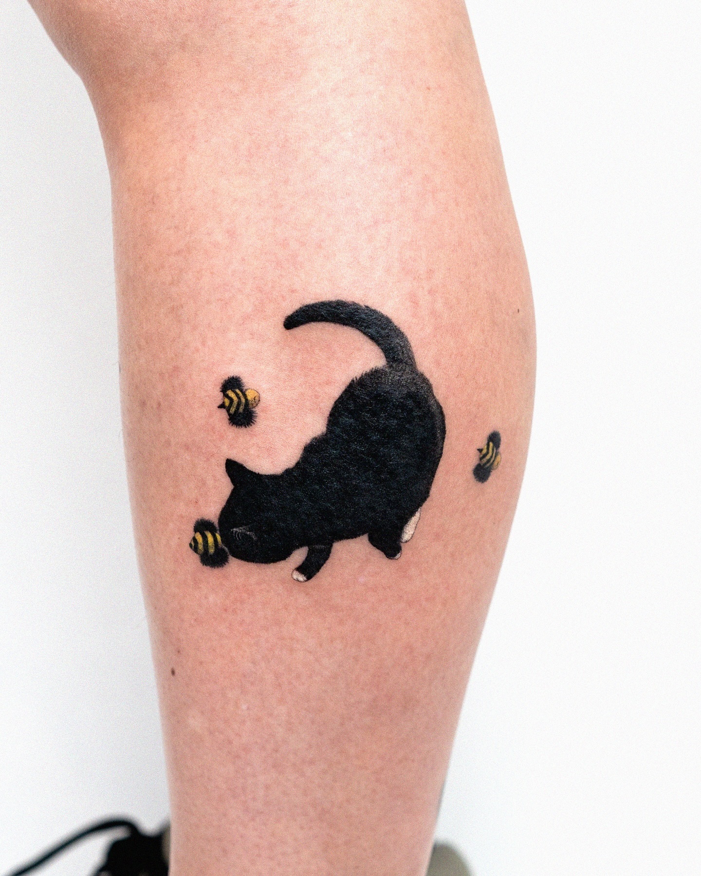 This delightful tattoo captures a curious black cat playfully interacting with buzzing bees. The intricate details bring the scene to life, making it feel almost animated. For those thinking about getting a small tattoo, consider a design that reflects your personality or interests, just like this one does!