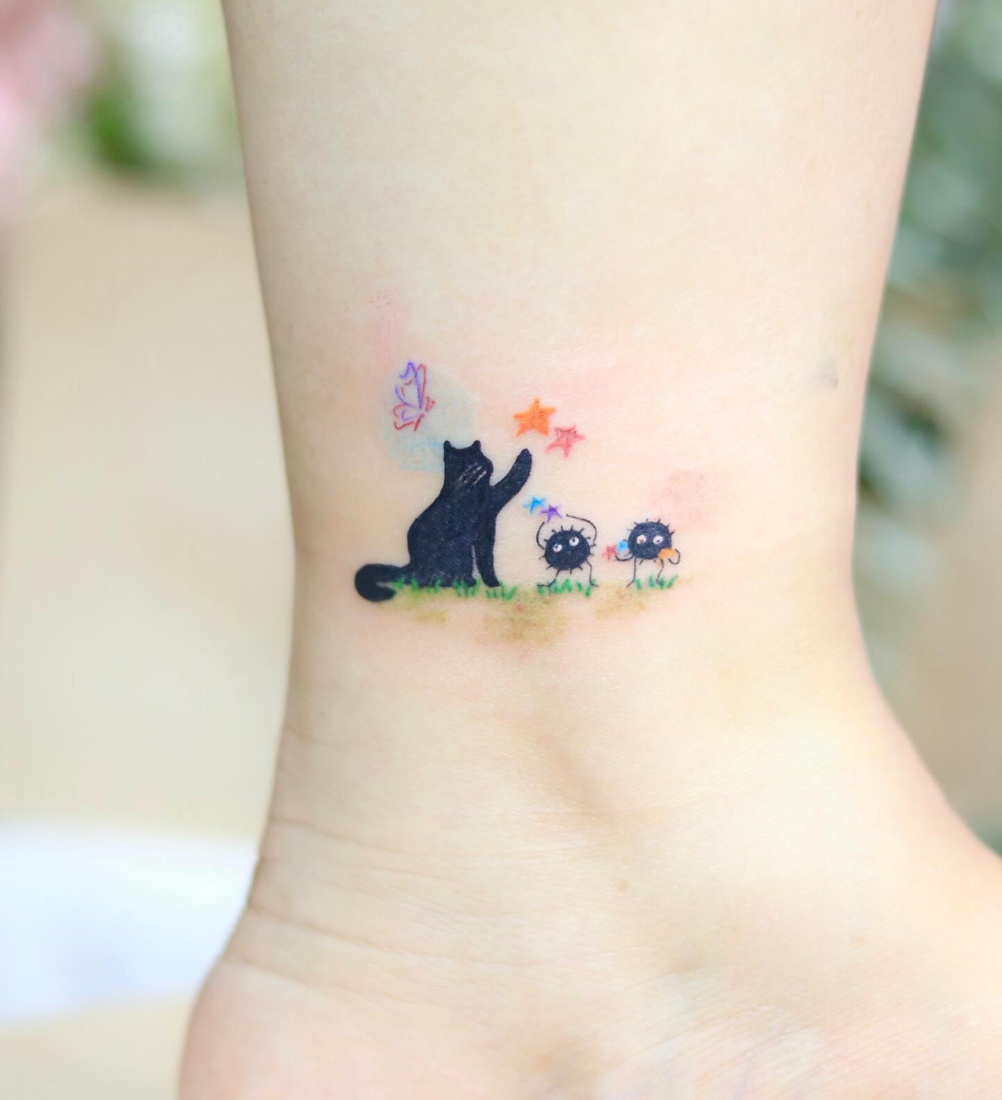 This delightful tattoo captures a playful black cat reaching for colorful stars alongside two adorable little creatures. The whimsical scene adds a touch of magic, making it a perfect reminder of the joy that pets bring into our lives. For those considering a small tattoo, think about a design that reflects your personality and memories!