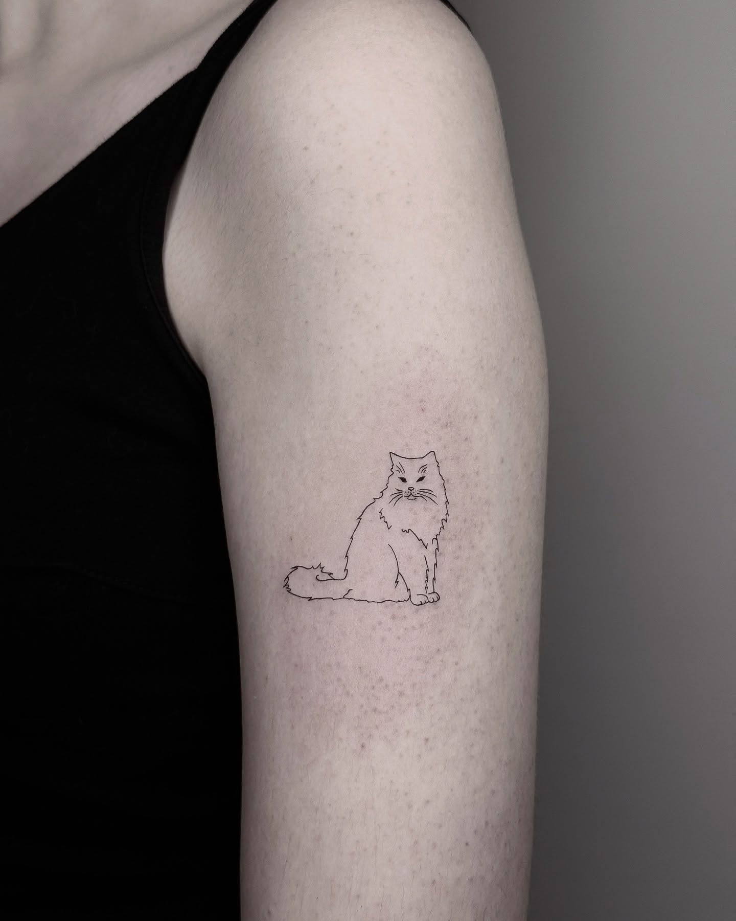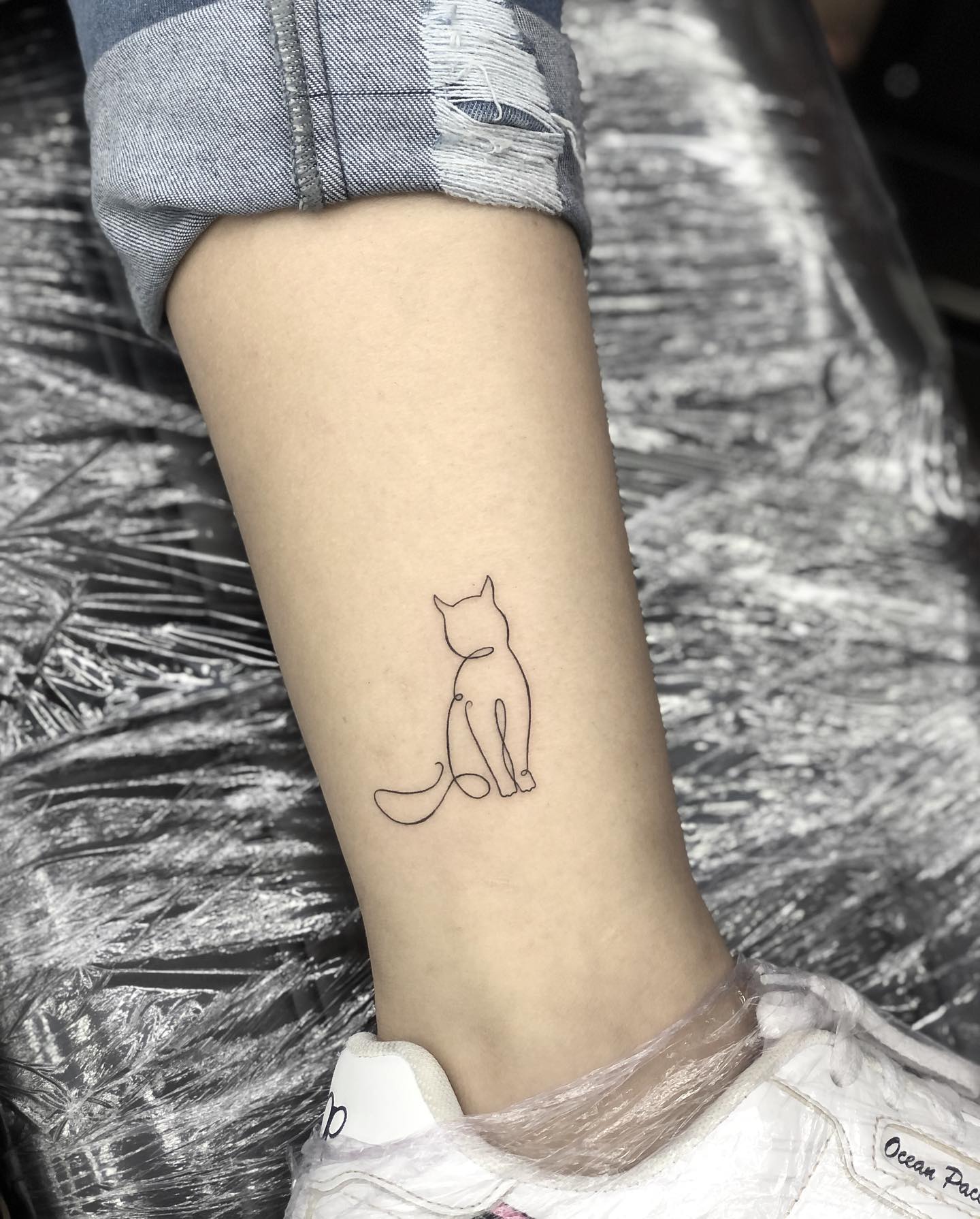 This delightful tattoo features a simple yet elegant outline of a cat, showcasing the beauty of minimalism. The clean lines capture the essence of feline grace, making it a perfect choice for cat lovers who appreciate subtlety in their body art. Choosing a small tattoo like this can be a wonderful way to express personal style without overwhelming the skin.