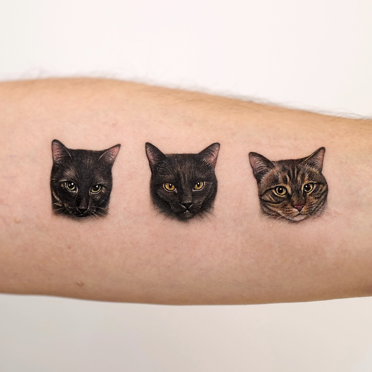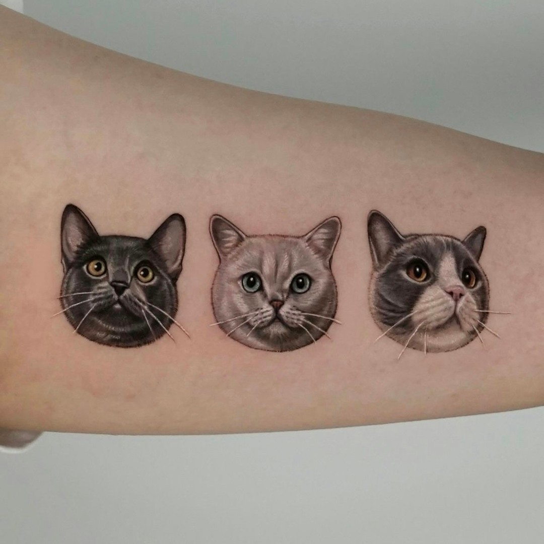 This tattoo showcases three adorable cat faces, each with its own unique expression and charm. The artistry captures the playful personalities of these furry friends, making it a delightful choice for any cat lover. For those considering a similar design, think about representing your own pets for a truly personal touch.