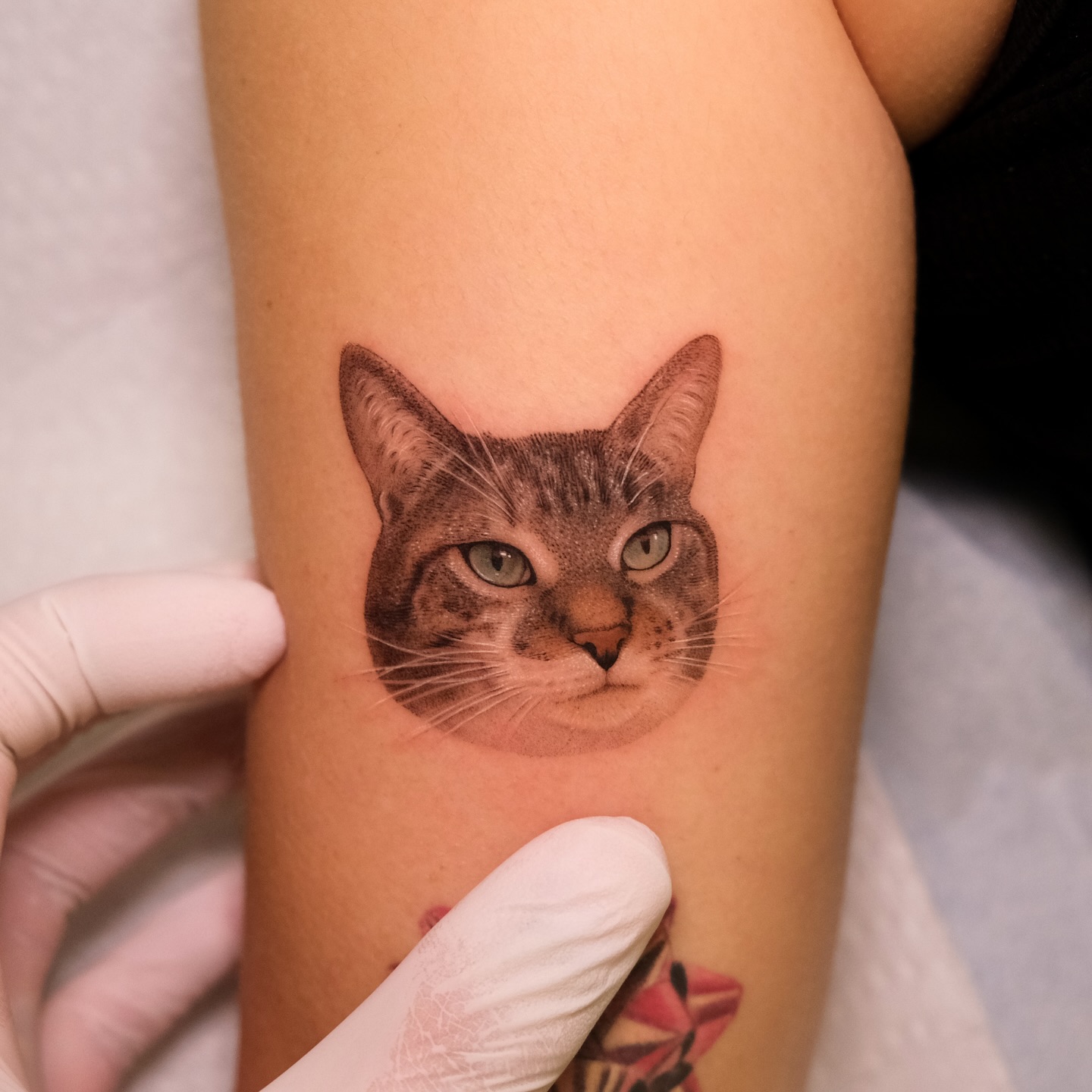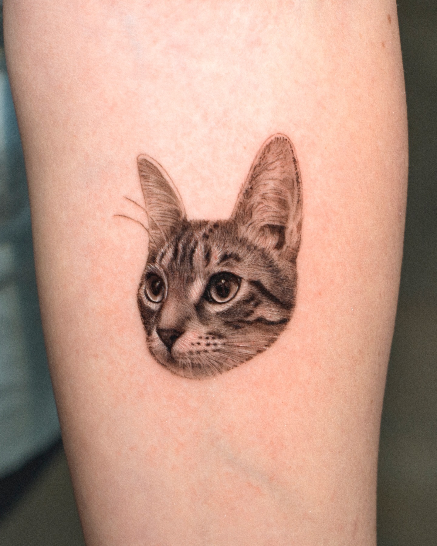 This image showcases a stunningly detailed tattoo of a cat s face, capturing its expressive eyes and soft fur. The design stands out not only for its realism but also for the way it reflects the owner’s love for their feline friend. For those considering a small tattoo, choosing a meaningful subject, like a beloved pet, can add a personal touch that tells a unique story.