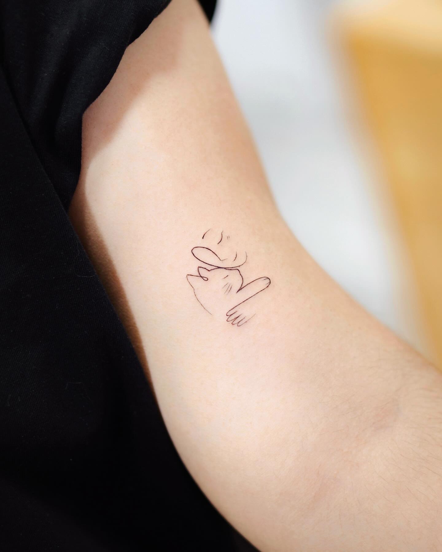 This delightful tattoo captures the tender moment of a person gently hugging a cat, showcasing a bond that many pet lovers cherish. The simple yet artistic design highlights the affection between humans and their feline friends. For those considering a small tattoo, choosing a meaningful image like this can serve as a constant reminder of the joy pets bring into our lives.