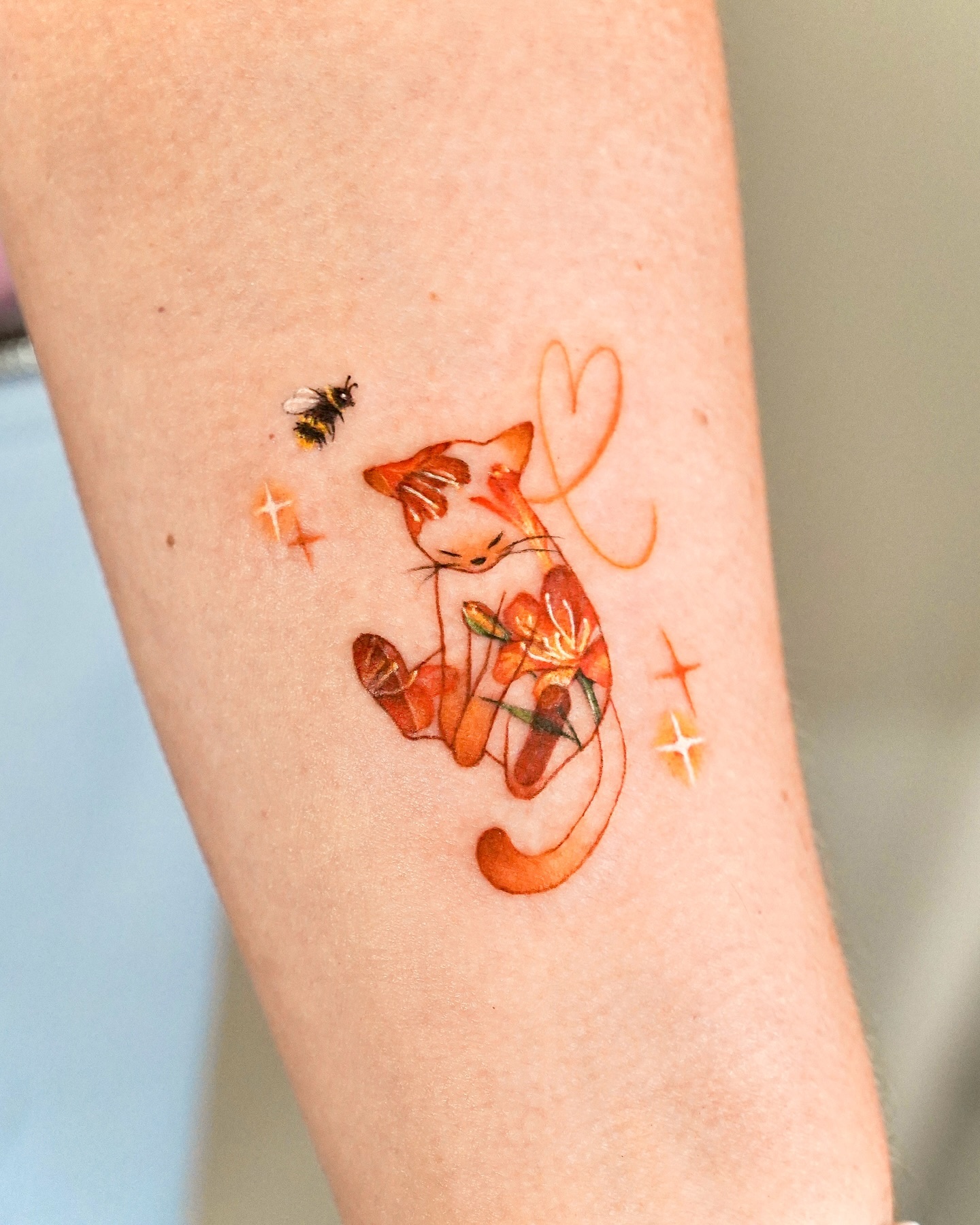 This delightful tattoo showcases a charming cat nestled among colorful flowers, with a tiny bee buzzing nearby. The warm colors and playful design create an inviting scene that celebrates the beauty of nature and companionship. For anyone considering a small tattoo, choosing a design that reflects personal interests can make it even more special.