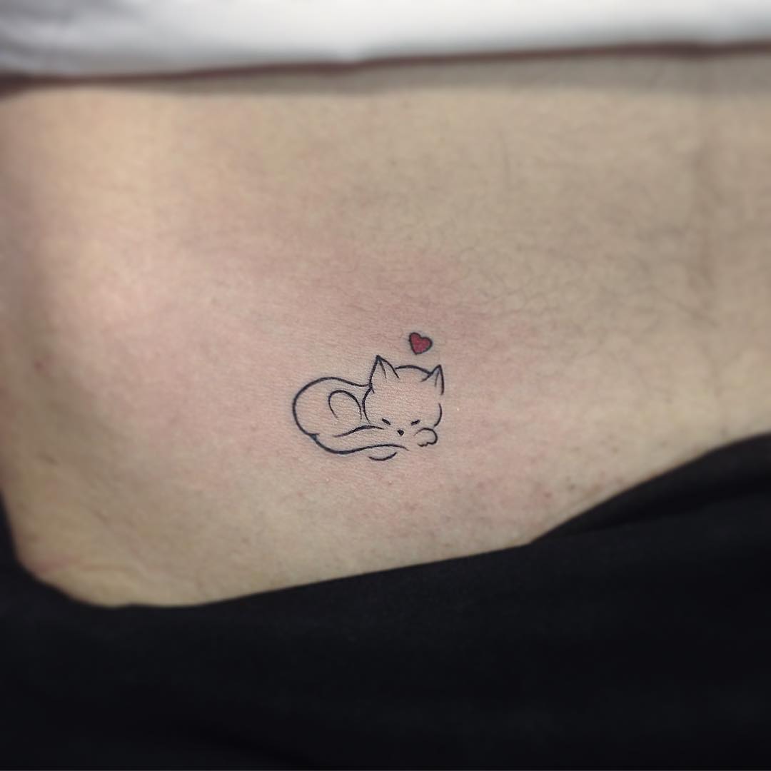 This charming tattoo captures the cozy essence of a sleeping cat, complete with a little heart above its head. The simple lines and soft curves convey a sense of warmth and affection, making it a perfect tribute for cat lovers. Choosing a small design like this can be a sweet reminder of the joy pets bring into our lives.