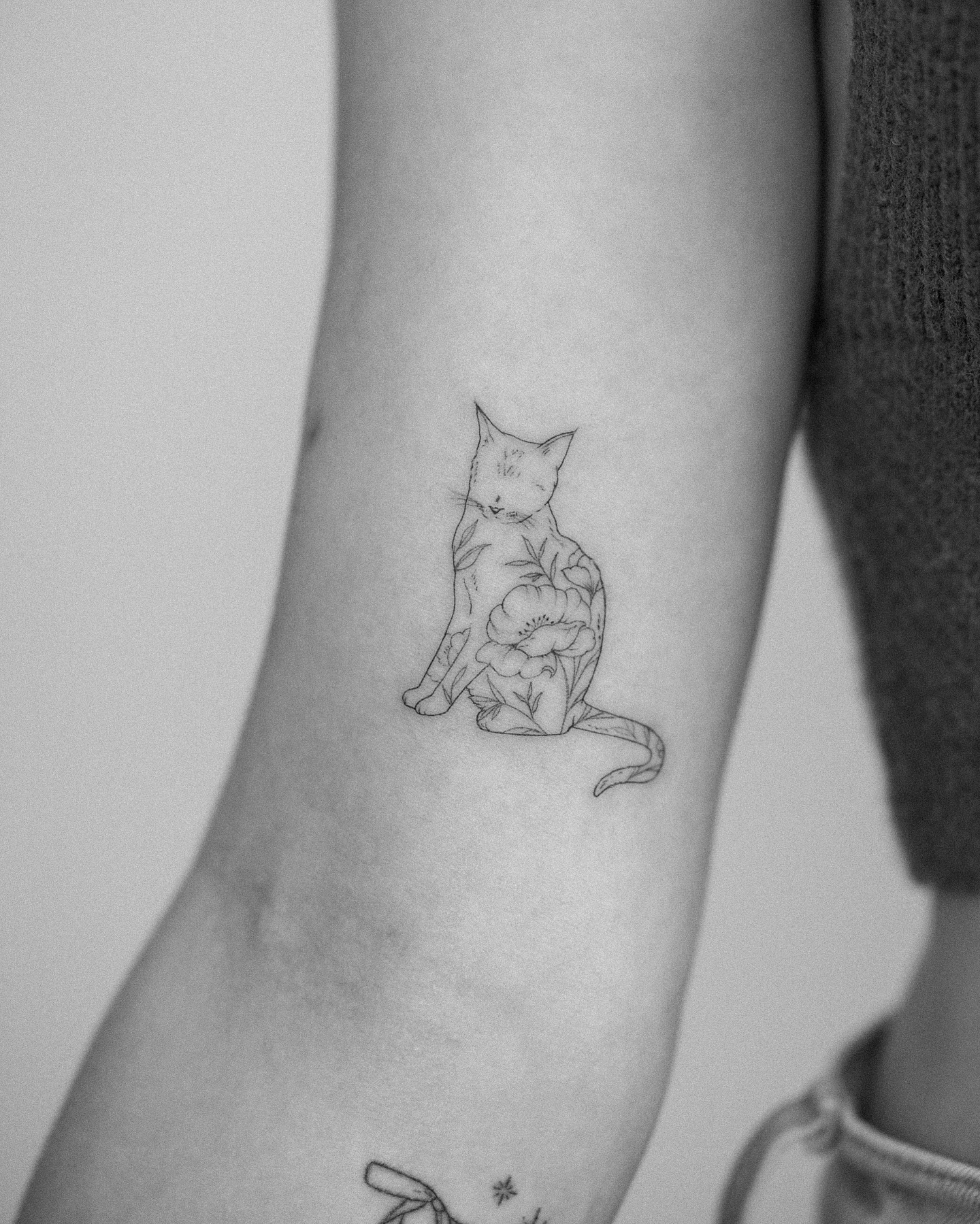 This delightful tattoo features a cat sitting gracefully, surrounded by intricate floral designs. The soft lines and delicate details make it a beautiful expression of love for cats. For those considering a small tattoo, choosing an image that holds personal meaning can make it even more special.