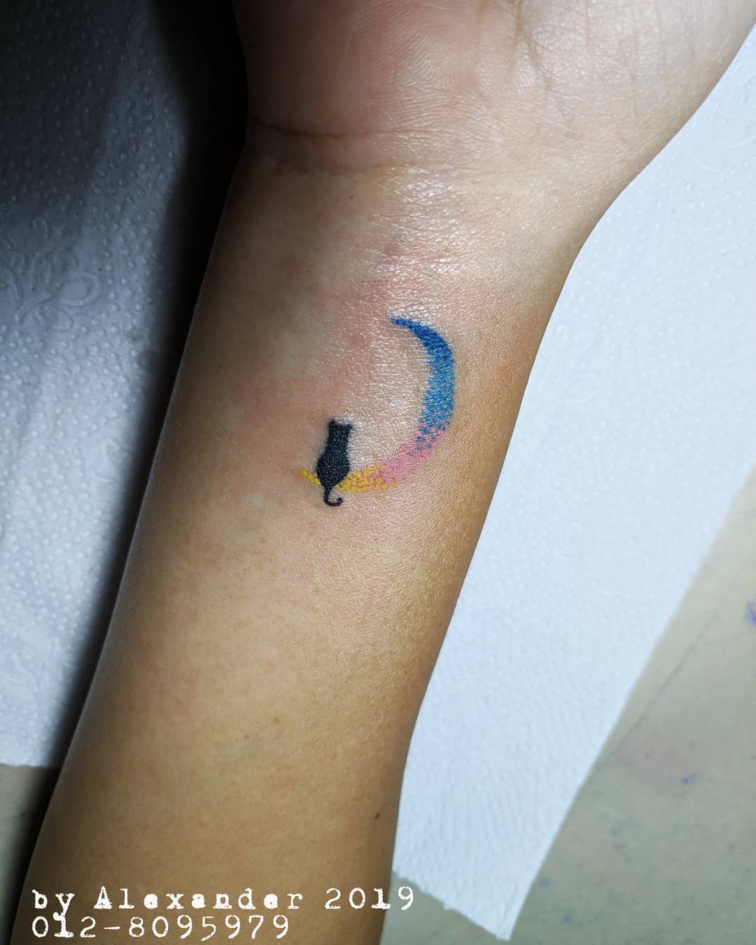 This charming tattoo features a sleek silhouette of a cat nestled against a colorful crescent moon. The vibrant hues create a playful atmosphere, making it a delightful piece for any cat lover. For those considering small tattoos, think about how meaningful symbols can tell a personal story in a compact design.