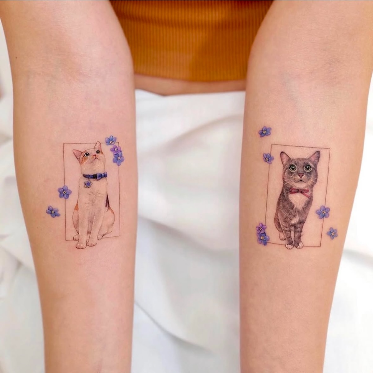 This delightful image showcases two beautifully designed cat tattoos that capture the unique personalities of these furry friends. Surrounded by delicate flowers, each cat seems to tell its own story, making them a perfect tribute for any pet lover. Choosing small tattoos like these can be a lovely way to carry a piece of one’s beloved companions wherever they go.