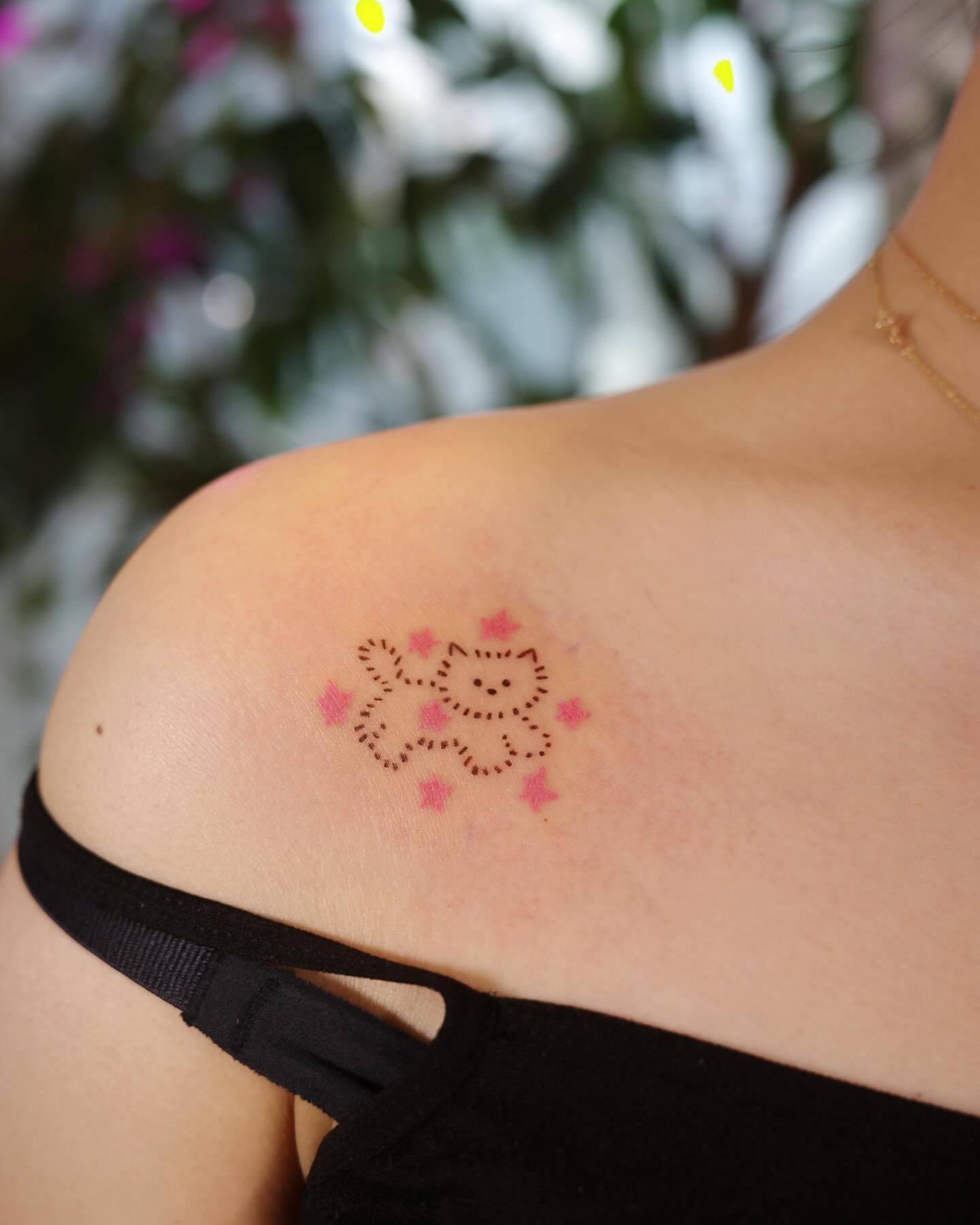 This delightful tattoo showcases a playful cat surrounded by cute stars, adding a touch of whimsy to the shoulder. The soft pink and black design makes it stand out while keeping a sweet, lighthearted vibe. For those considering small tattoos, choosing a design that reflects personal interests can make the art even more meaningful.