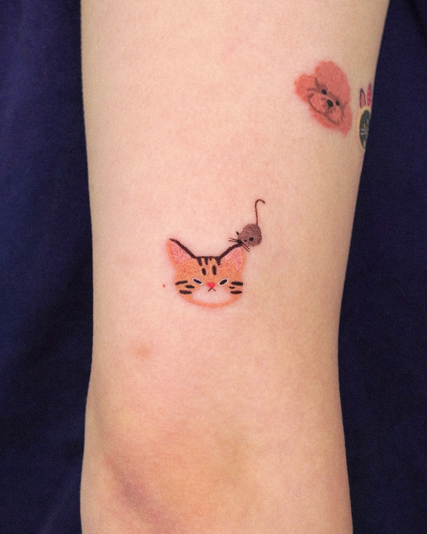 This delightful tattoo captures the playful spirit of a cat, peeking out with a charming little mouse nearby. The soft colors and cute expressions bring a sense of joy and whimsy to the design, making it a perfect choice for animal lovers. For those considering small tattoos, remember that the best designs often tell a story that reflects your personality.
