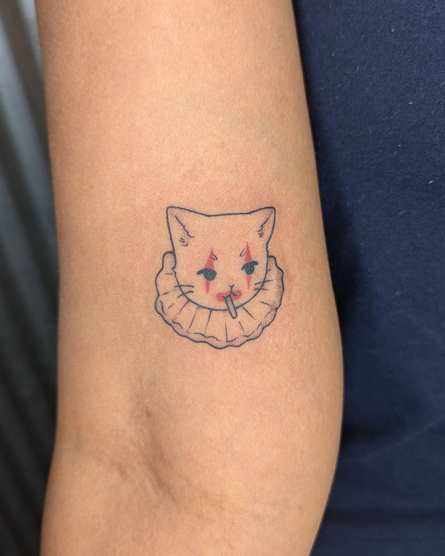 This tattoo features an adorable cat with a playful ruff, giving it a unique charm. The red details add a fun contrast to the soft colors, showing off the artist’s creativity. A small tattoo like this can make a big statement, reminding wearers to embrace their quirky side.