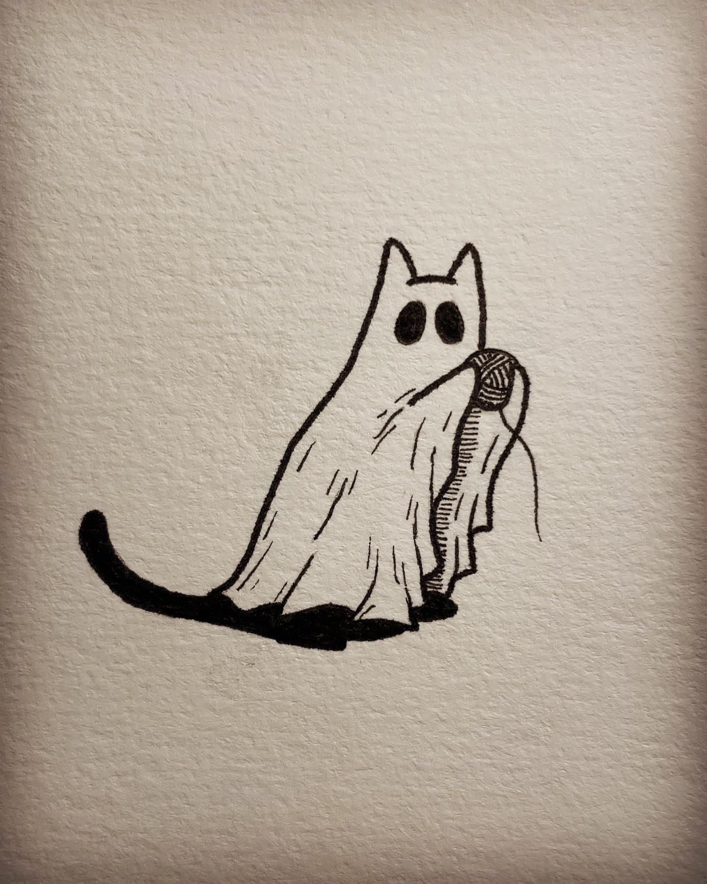This charming tattoo features a playful cat dressed as a ghost, complete with a yarn ball in its mouth. The fun design adds a whimsical touch, making it perfect for cat lovers who enjoy a bit of humor in their ink. For those considering a small tattoo, this design shows how creativity can turn a simple idea into something memorable.
