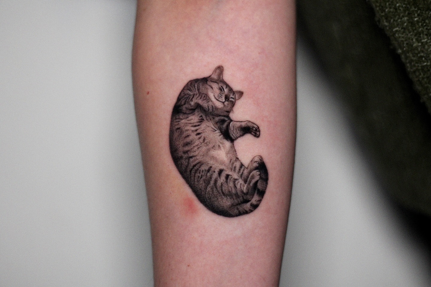 This delightful tattoo captures the essence of a cat in its most relaxed state, showcasing its adorable features as it naps. The attention to detail in the tiny paws and facial expression brings the design to life, making it feel like a real pet is lounging on the skin. For cat lovers, this small tattoo is a fantastic way to carry a piece of their furry friend wherever they go.