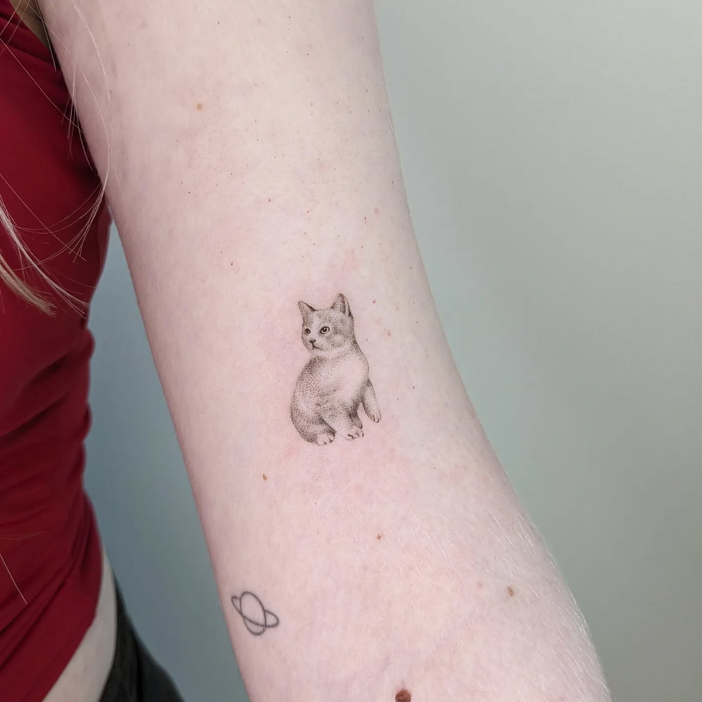 This image showcases a delightful small tattoo of a cute cat, perfectly capturing its playful spirit. The fine details in the design make it look almost lifelike, celebrating the joy that cats bring to many people’s lives. A small tattoo like this can be a wonderful way to express love for pets without making a big statement.
