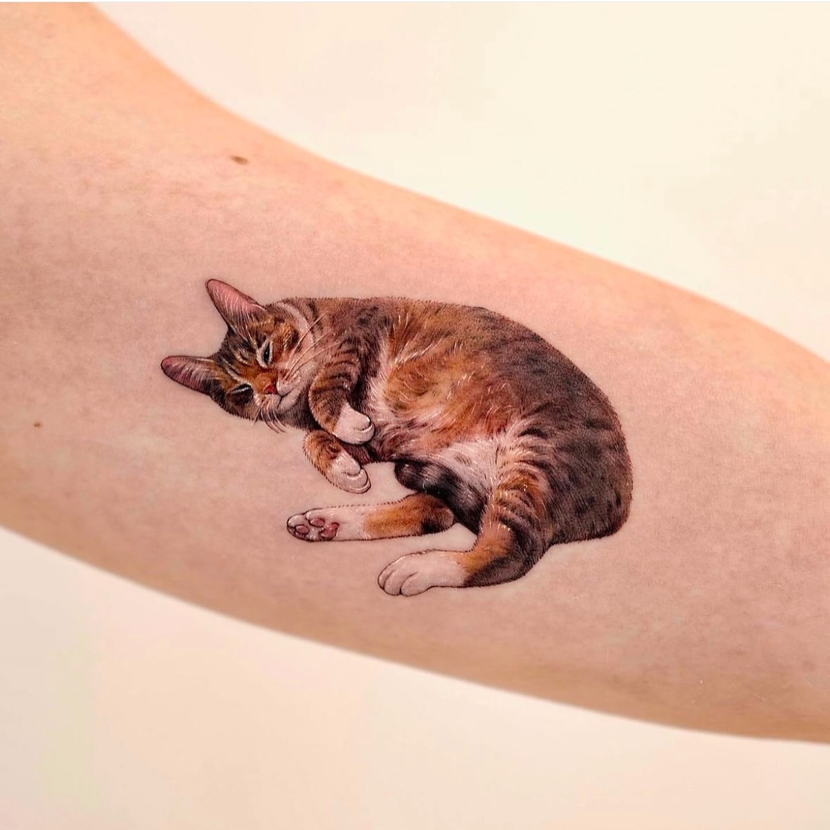 This image showcases an incredibly realistic tattoo of a cat curled up and peacefully sleeping. The intricate details make it look almost lifelike, capturing the essence of a cozy moment. For those considering a small tattoo, choosing a beloved pet design can be a meaningful way to celebrate their presence in life.