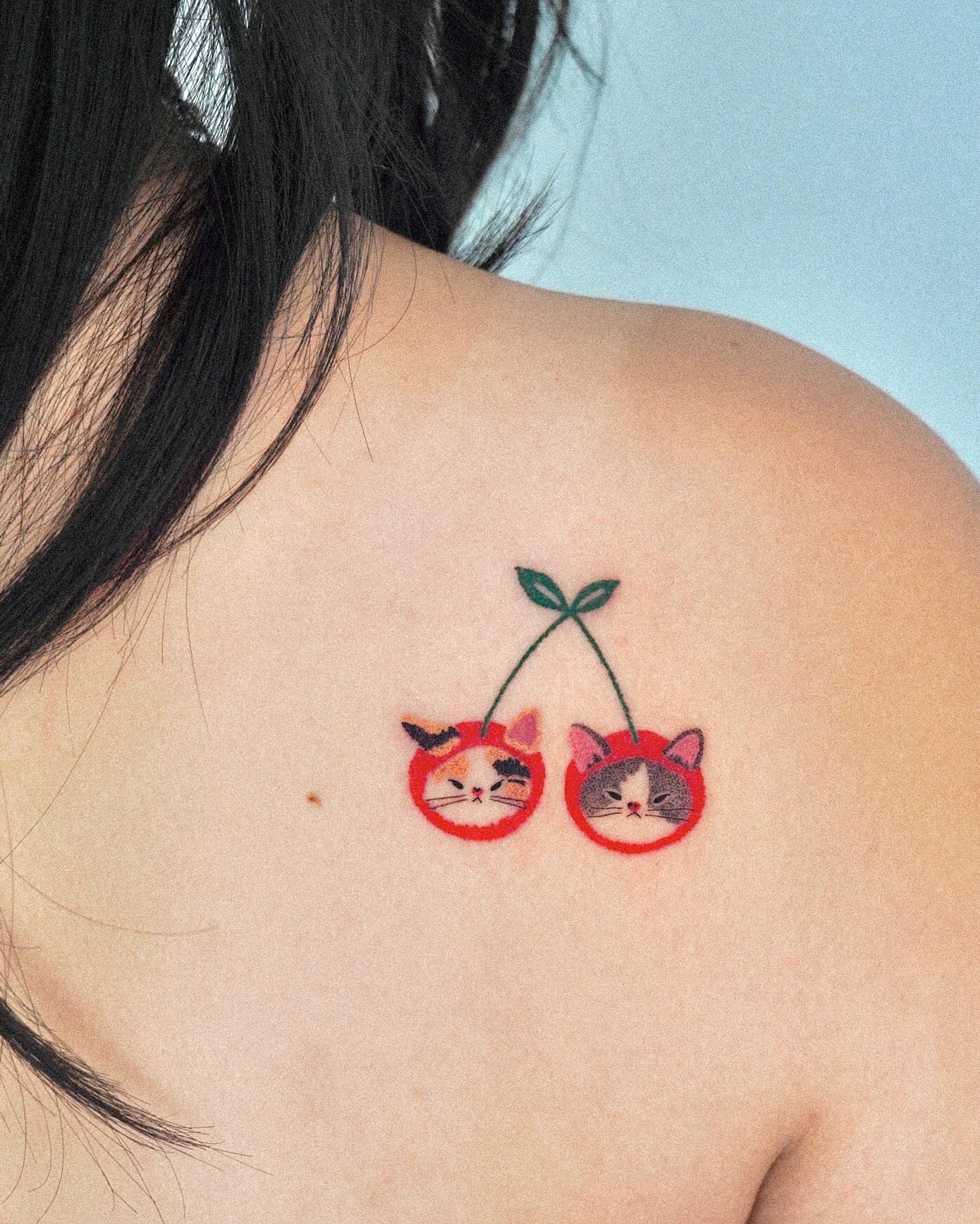 This delightful tattoo captures the playful spirit of two adorable cats nestled inside cherry shapes. The vibrant colors and cute expressions make it a standout piece that brings joy to anyone who sees it. For those considering a small tattoo, choosing a design that reflects personal interests can create a meaningful connection.