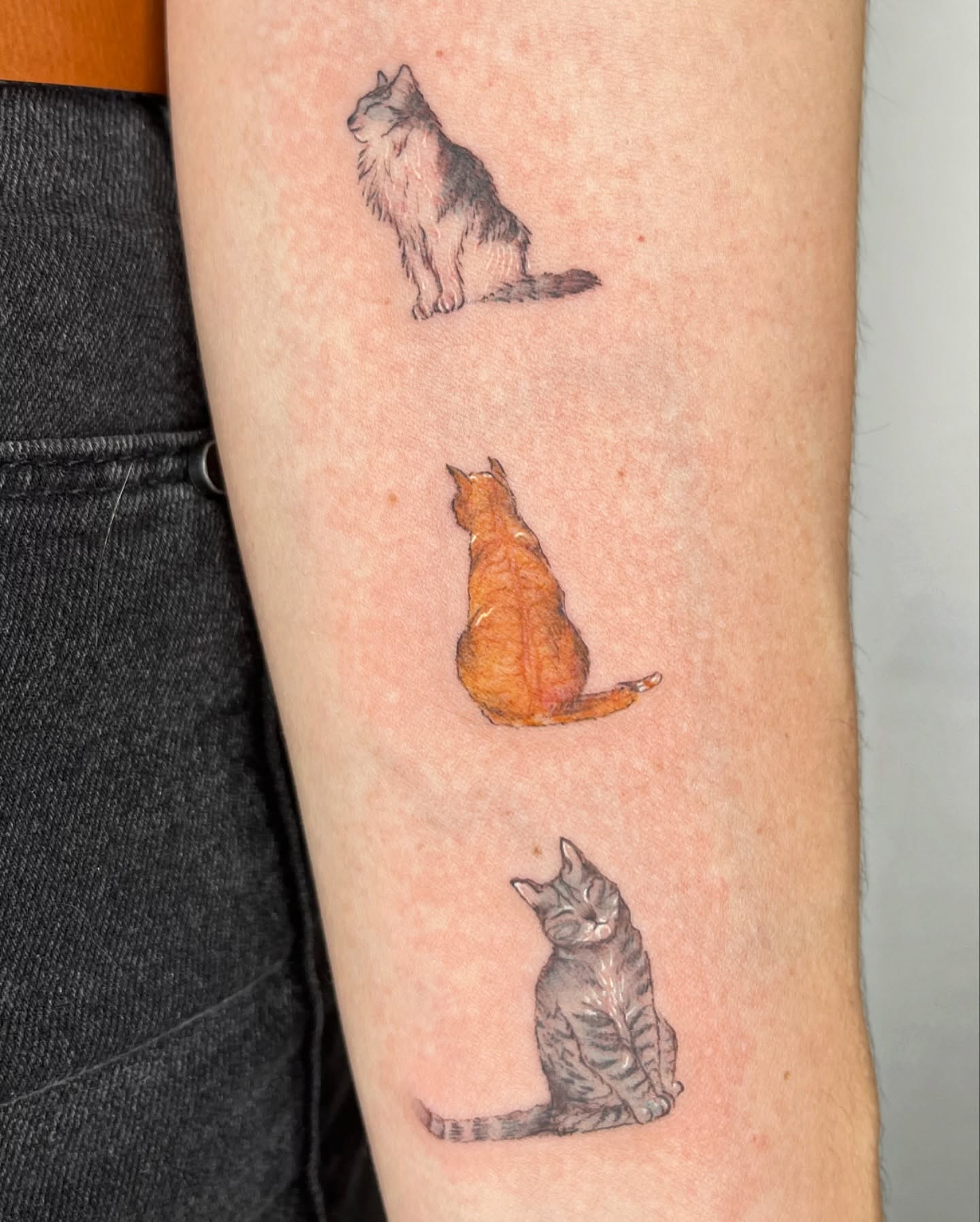 This delightful tattoo design showcases three distinct cat silhouettes, each capturing a unique personality. The careful detail in each design brings the playful essence of cats to life, making them a perfect choice for any feline lover. For those considering similar tattoos, choosing a design that reflects personal memories or favorite cats can add an extra layer of meaning.