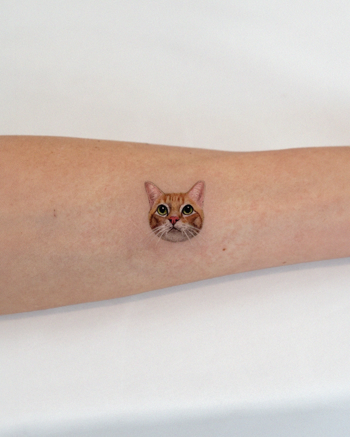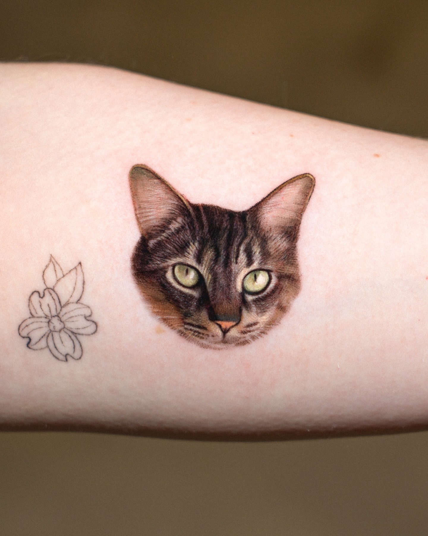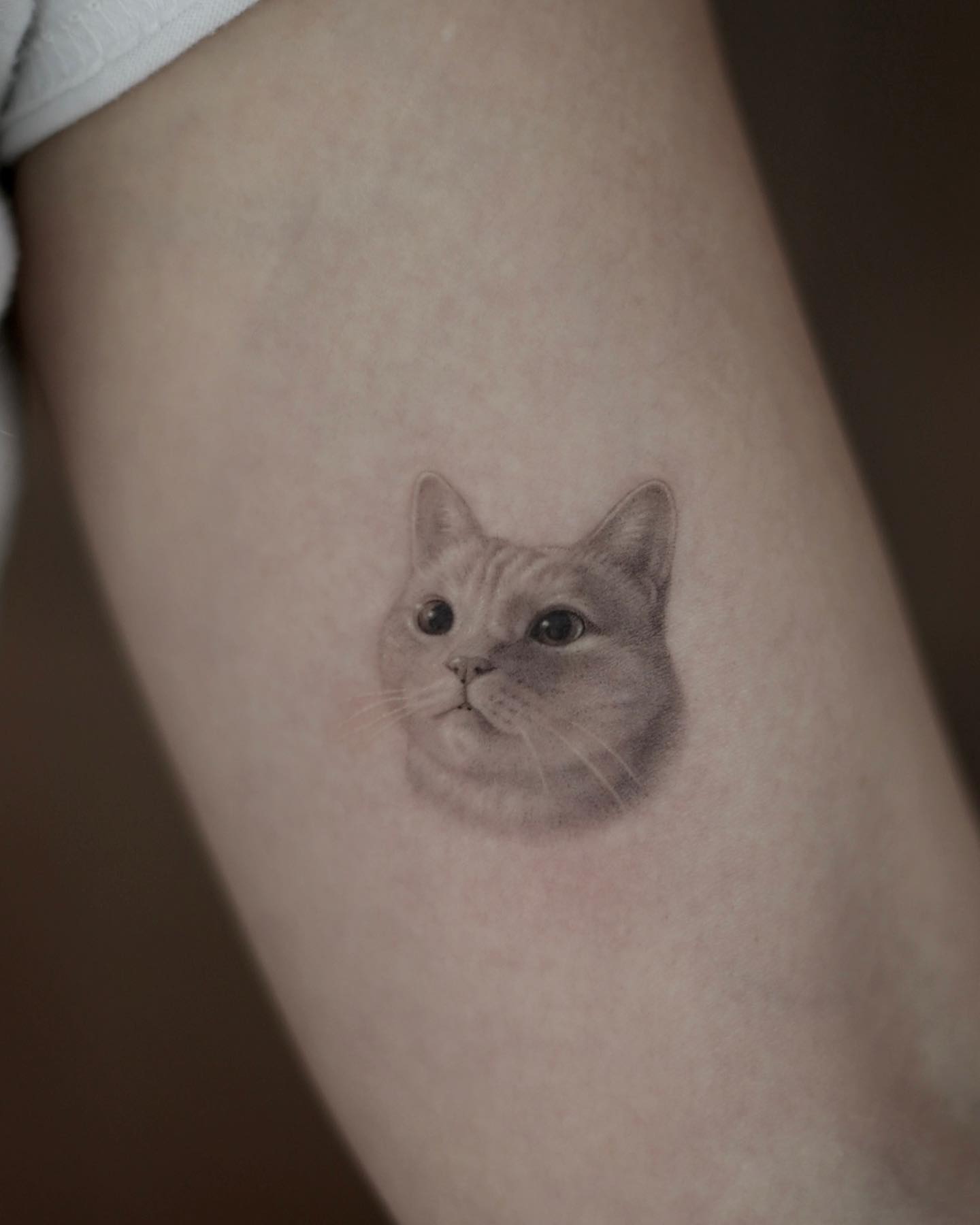 This tattoo stands out with its stunningly detailed depiction of a cat’s face, capturing the animal s unique expression perfectly. The artist’s skill brings the feline to life, making it feel as if it could leap off the skin. For those considering a small tattoo, opting for a meaningful design like this one can create a lasting connection to a beloved pet.