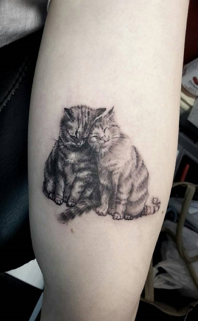This tattoo showcases two beautifully detailed cat faces, making it a delightful tribute to feline friends. The lifelike quality of the designs captures the unique personalities of each cat, inviting admiration from anyone who sees them. For those considering similar tattoos, choosing a style that reflects your pet’s character can make the piece even more special.