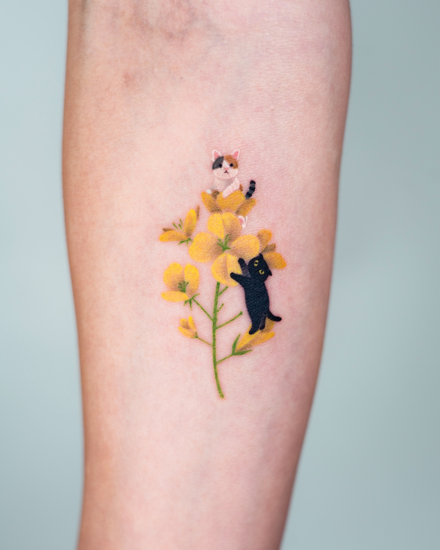 This delightful tattoo features two playful cats nestled among bright yellow flowers, creating a cheerful scene. The combination of cute animals and vibrant blooms brings a sense of joy and warmth to the design. For those considering a small tattoo, incorporating personal elements like favorite pets can make it even more special.