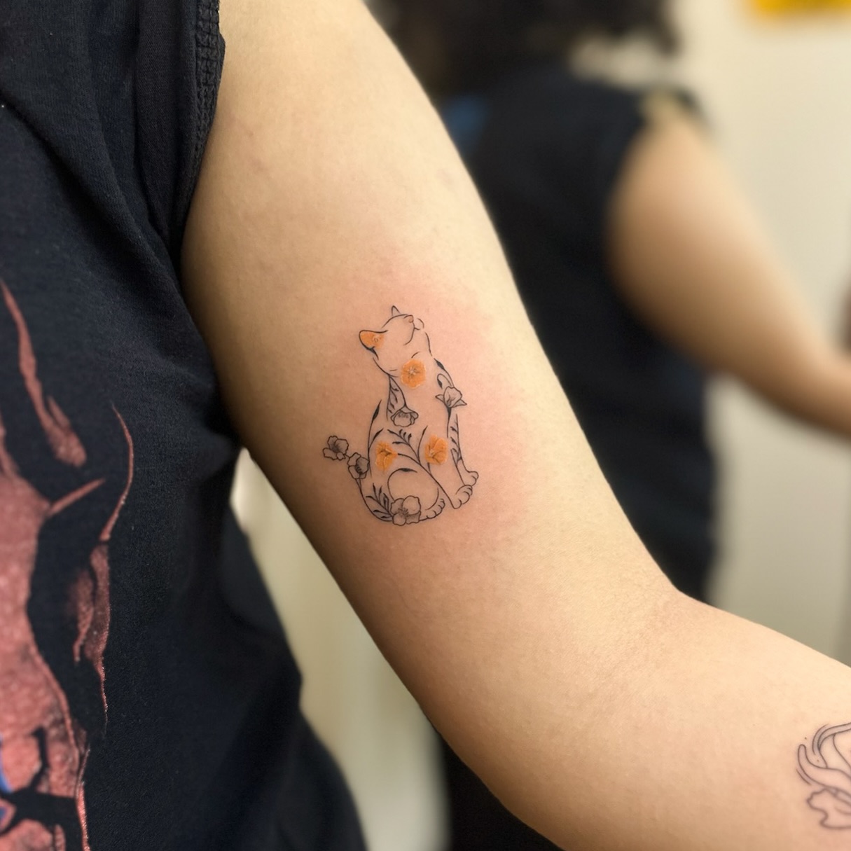This delightful tattoo captures the essence of a cat in a whimsical way, showcasing soft colors and floral designs. The gentle lines and artistic flair make it a perfect tribute for cat lovers who appreciate unique body art. Choosing a small tattoo can be a wonderful way to express personal style while keeping it subtle and elegant.