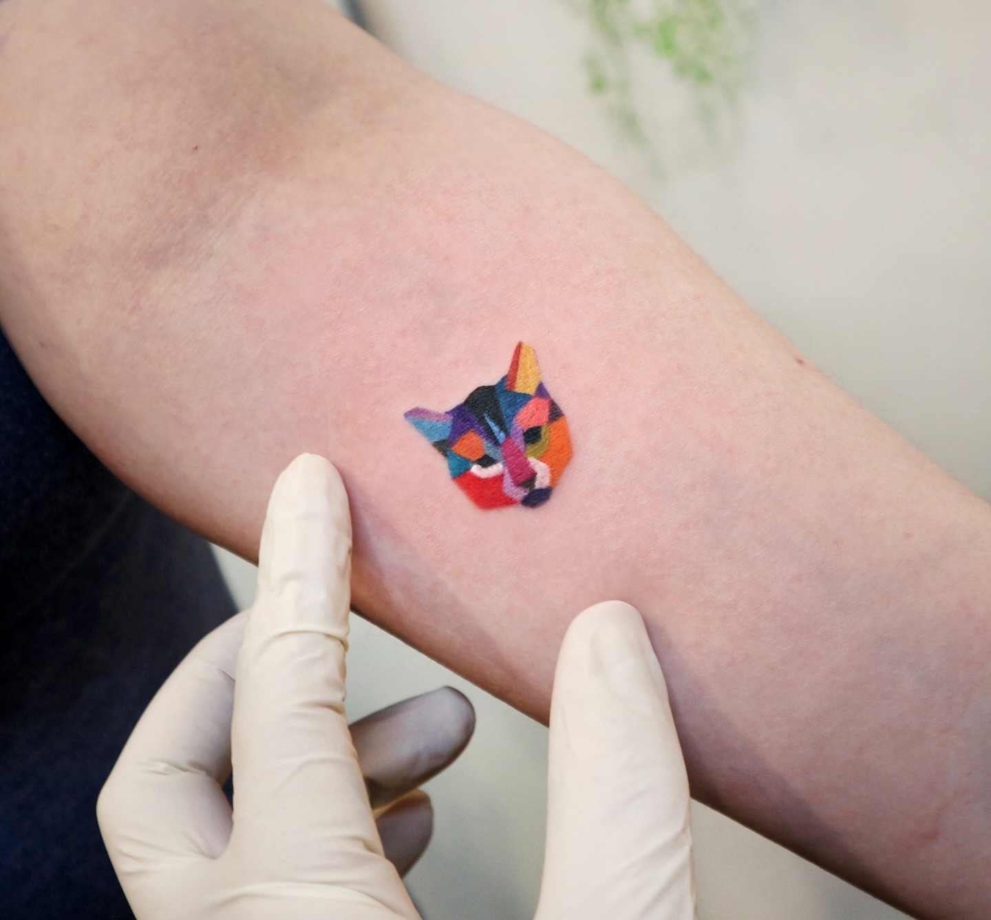 This charming tattoo features a vibrant, geometric design of a cat’s face, showcasing a blend of colors that pop against the skin. The artist’s unique style captures the essence of feline grace and personality in a small space. For anyone considering a tattoo, choosing a design that reflects personal interests can make it even more special.