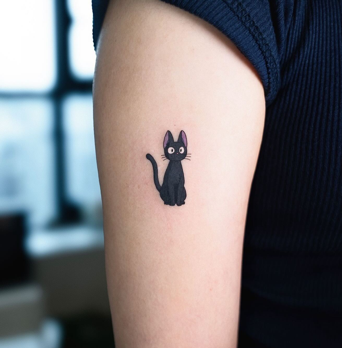 This delightful tattoo features an adorable black cat, complete with expressive eyes and perked ears, adding a playful touch to the skin. The whimsical design captures the essence of feline charm, making it a perfect choice for cat lovers. When considering a small tattoo, think about personalizing it with elements that reflect your own unique style.