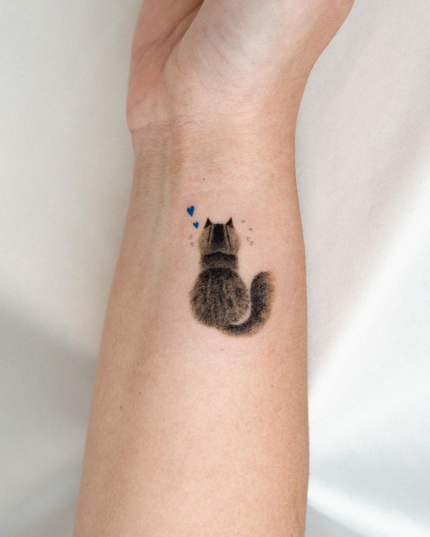 This delightful tattoo captures a cozy moment, showcasing a cat gazing thoughtfully with tiny hearts floating nearby. It beautifully reflects the bond between pet and owner, making it a perfect choice for cat lovers who want to carry a piece of that love with them. Choosing a small design like this can be a subtle yet meaningful way to express one s affection for their furry friends.