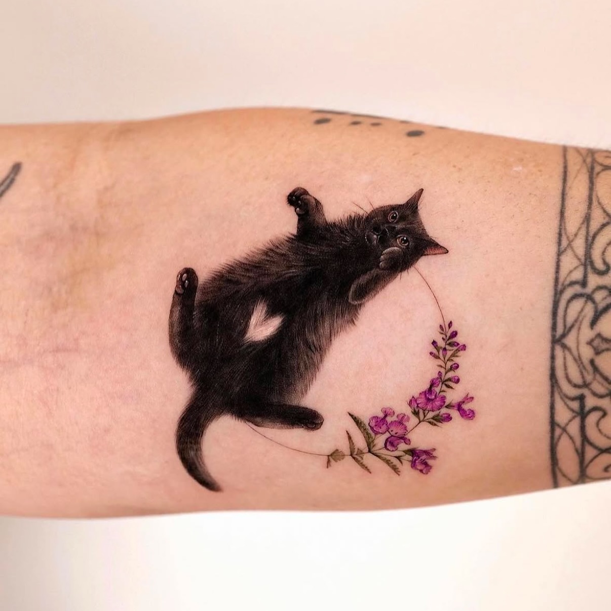 This charming tattoo captures the playful spirit of a black cat, complete with a whimsical floral design. The intricate details bring the image to life, making it a delightful piece for any cat lover. A small tattoo like this can serve as a lovely reminder of the joy pets bring into our lives.