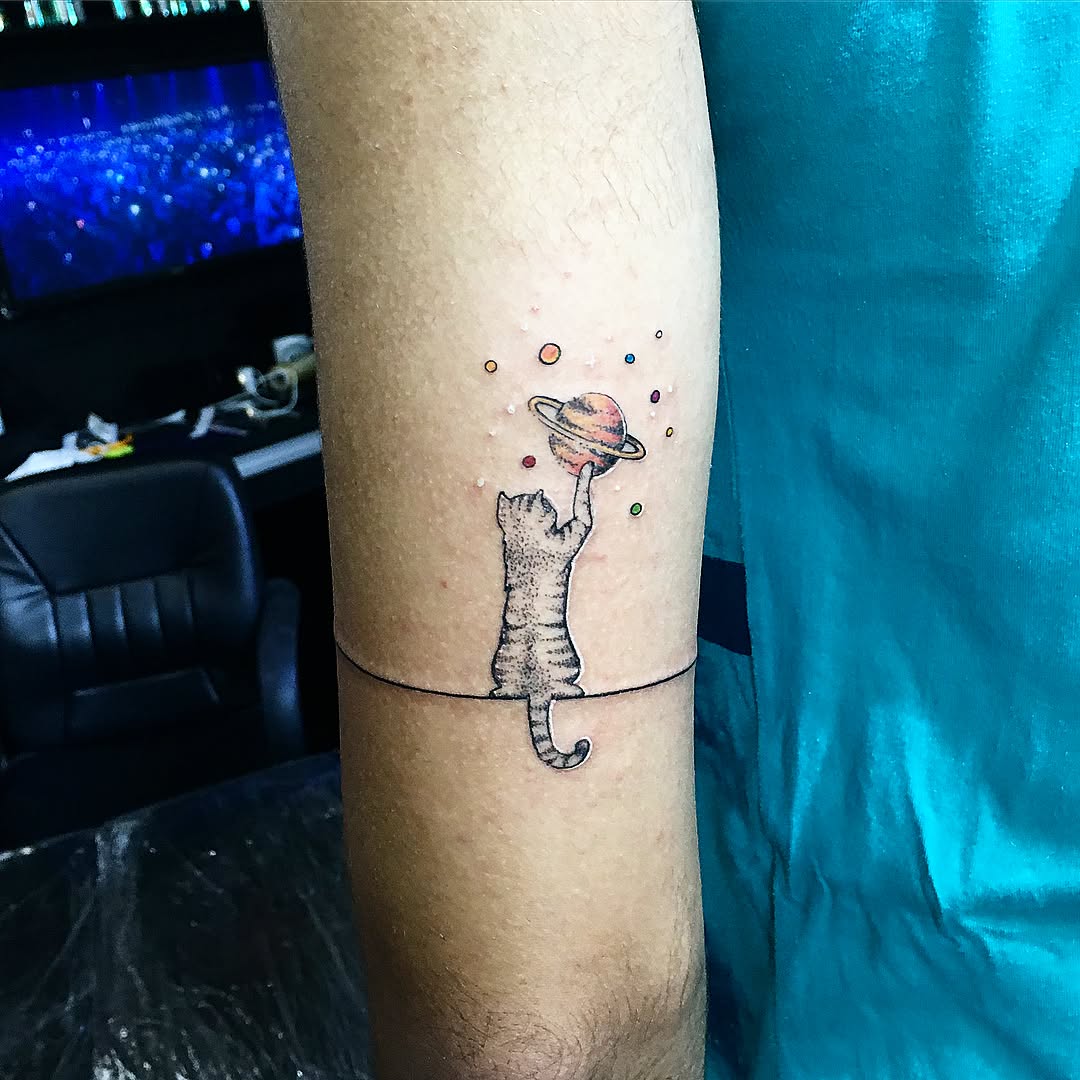 This delightful tattoo features a whimsical cat reaching for a colorful planet, capturing the imagination of anyone who sees it. The detailed artwork, combined with the playful scene, invites viewers to dream about the mysteries of space and the joy of exploration. For those considering a small tattoo, choosing a design that reflects personal interests can make it even more meaningful.