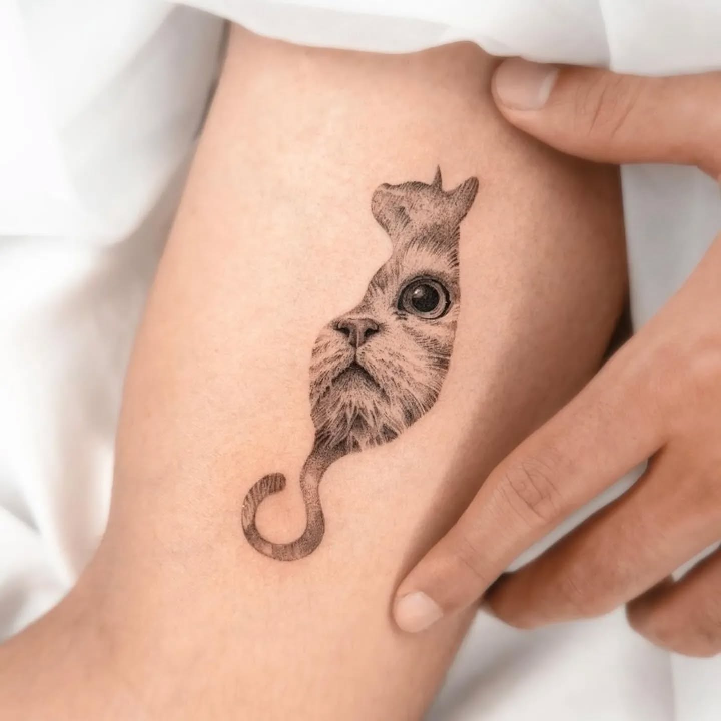 This tattoo beautifully captures the essence of a cat with its intricate details and unique shape. The clever design showcases a cat’s face intertwined with its silhouette, making it a remarkable piece of art. For those considering a small tattoo, this style is a charming way to express love for their feline friends while keeping it elegant and subtle.