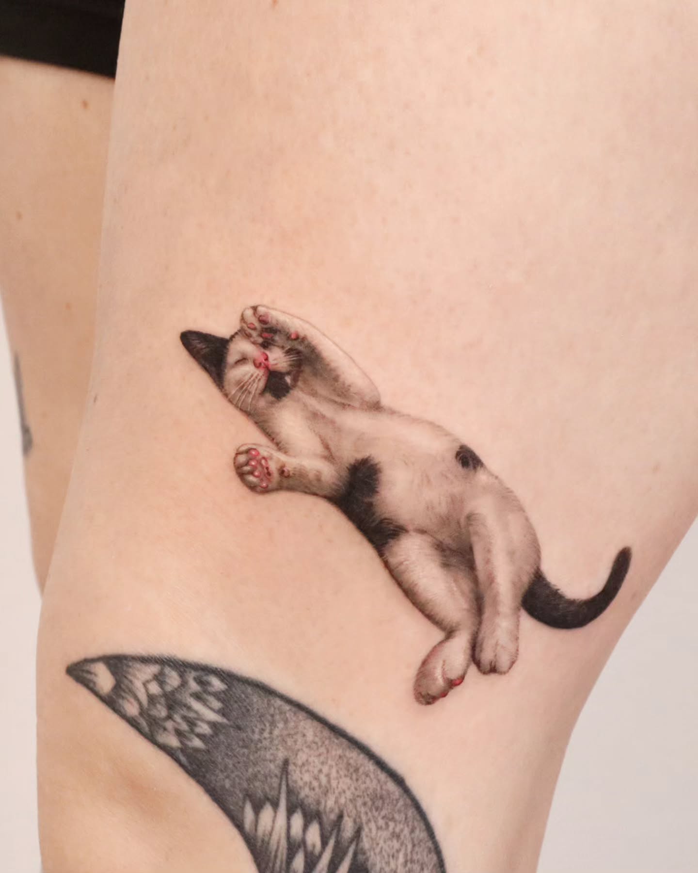 This delightful tattoo captures a cat in a cozy, curled-up position, showcasing its playful nature. The intricate details make it look almost lifelike, bringing warmth and charm to the design. For those who adore cats, a small tattoo like this can be a meaningful reminder of their furry friends.