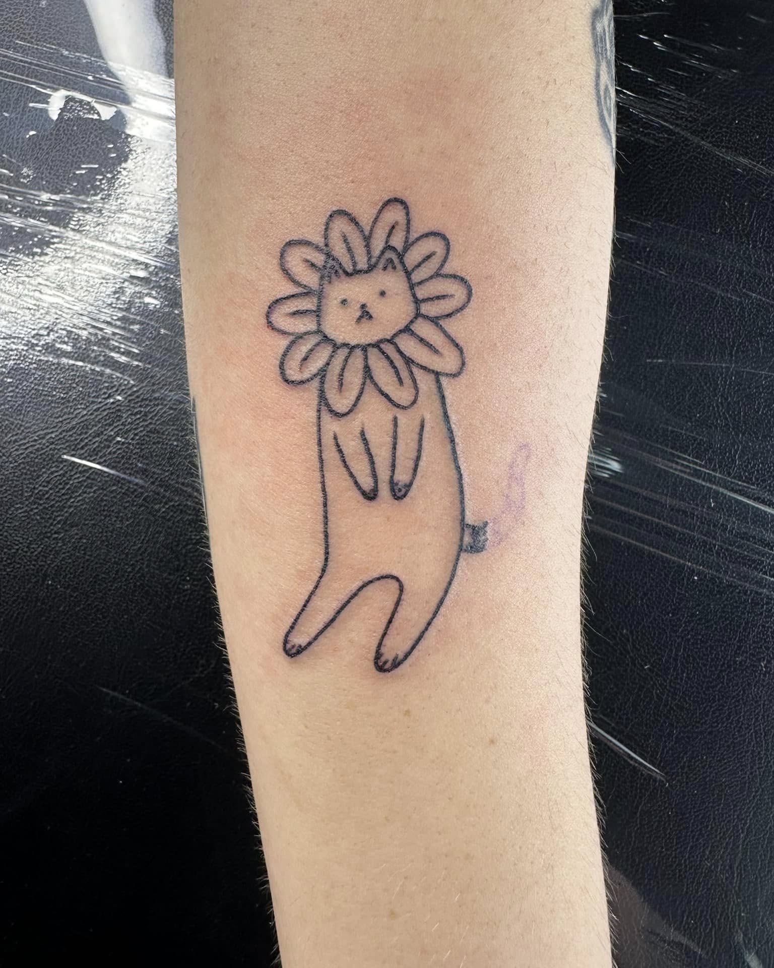 This charming tattoo features a cat with a flower-like mane, blending playfulness and creativity. Its unique design captures the whimsical nature of both cats and flowers, making it a delightful piece of art. For those considering a small tattoo, choosing a design that reflects personal interests can create a meaningful statement.