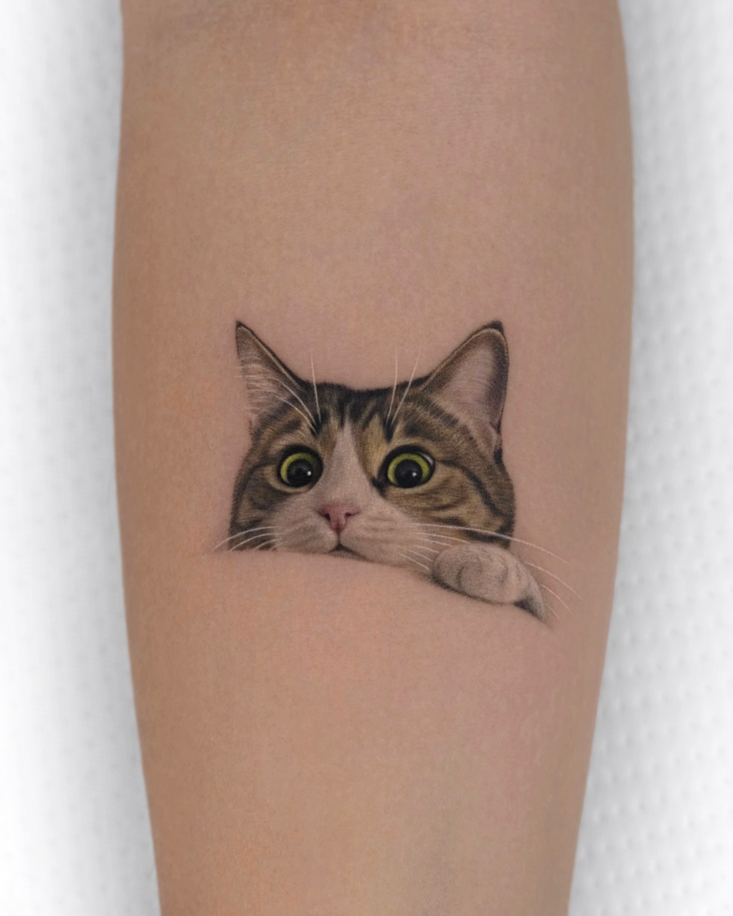 This tattoo showcases an adorable cat peering curiously from behind a surface, capturing a moment of playful intrigue. The artist s skill shines through in the detailed expression and lifelike features, making the little feline come to life on the skin. For cat lovers, this design serves as a delightful reminder of their furry friends’ quirky personalities.
