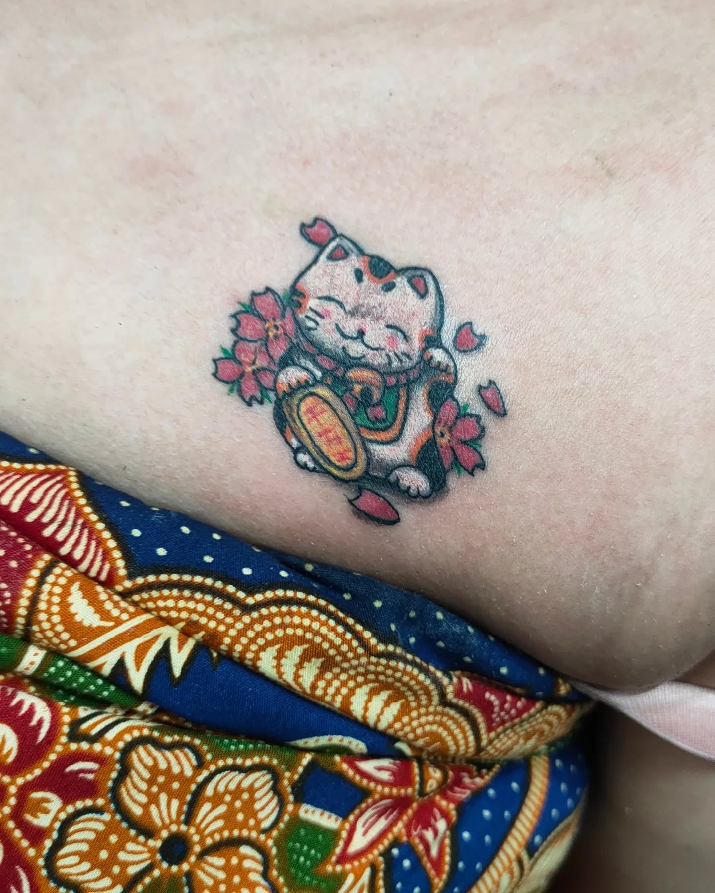 This charming tattoo features a playful lucky cat surrounded by delicate cherry blossoms, bringing a smile to anyone who sees it. The bright colors and joyful expression of the cat make it a delightful choice for tattoo lovers who appreciate a touch of whimsy. Choosing a small tattoo like this can be a fun way to showcase personality without overwhelming the skin.