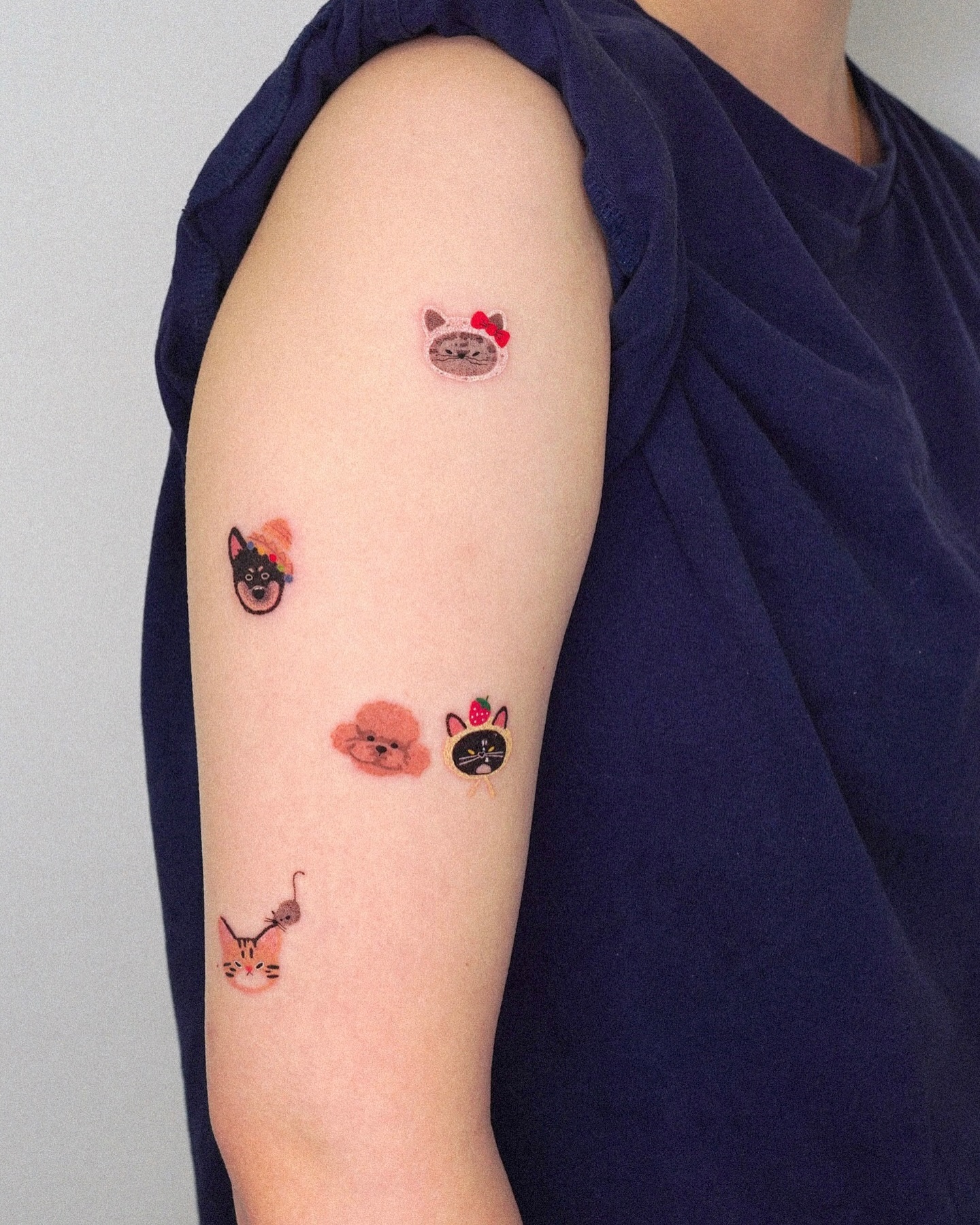 This charming collection of small cat tattoos brings a playful touch to any outfit. Each design showcases a unique expression, from a cute kitten with a bow to a whimsical cat with a strawberry hat. For those considering their own ink, choosing a small design can make a bold yet subtle statement.