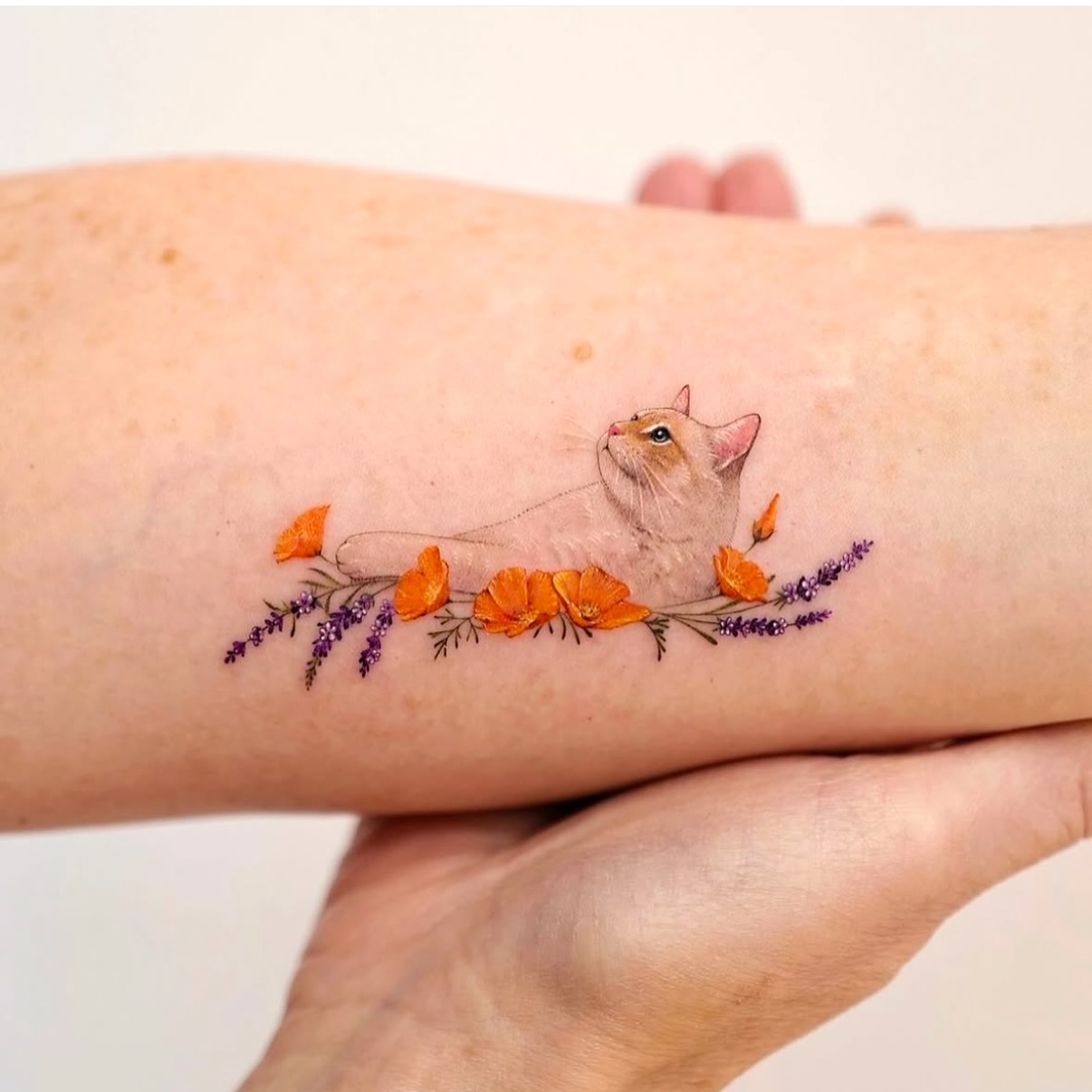 This delightful tattoo features a serene cat lounging among vibrant orange flowers and lavender. The soft colors and gentle details create a peaceful scene that feels both warm and inviting. For those considering a tattoo, choosing a design that reflects personal interests, like a beloved pet, can make it even more special.