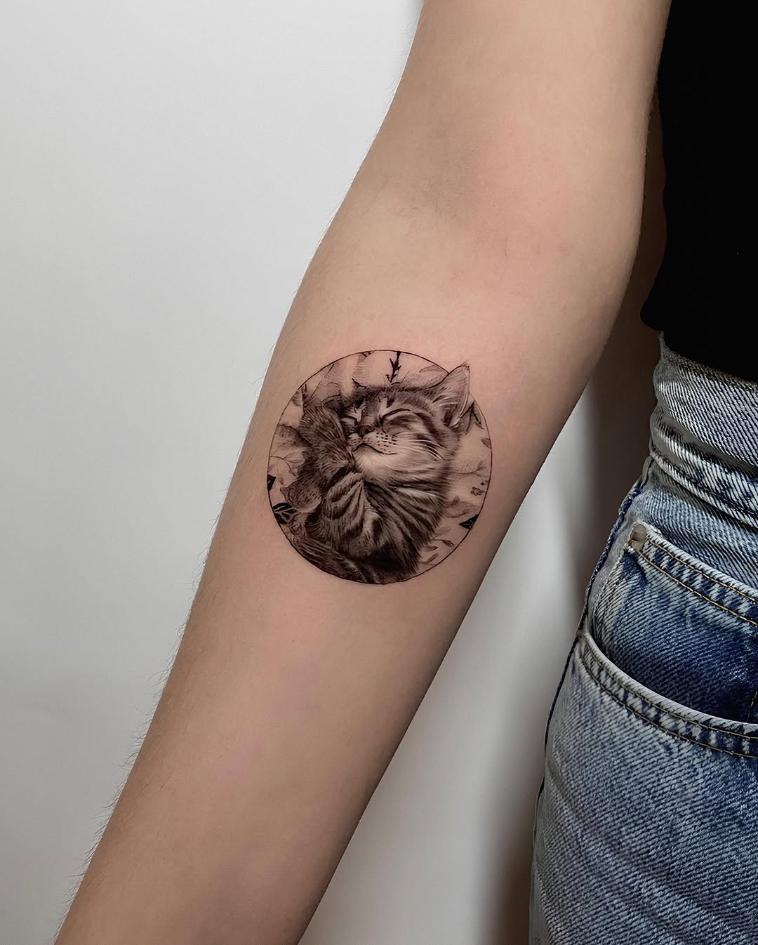 This tattoo beautifully captures a cat in a peaceful slumber, surrounded by delicate details that evoke a sense of calm. The soft lines and intricate shading make it feel almost lifelike, inviting viewers to appreciate the serene moment. For those considering a small tattoo, choosing something meaningful like this can create a special connection that lasts a lifetime.