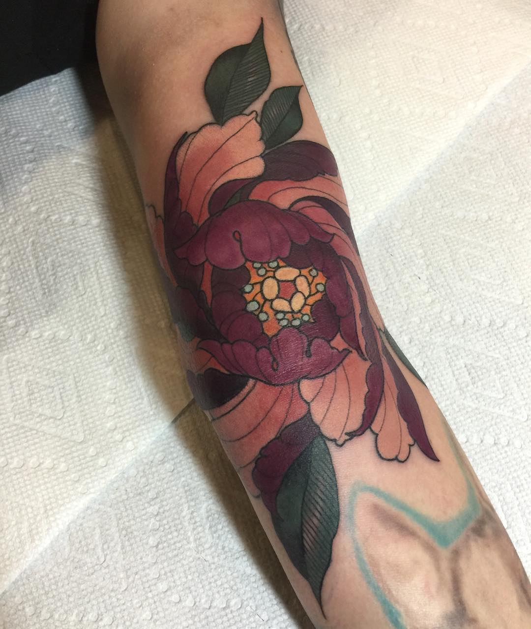 A large, colorful flower dominates the elbow area, showcasing rich shades of deep purple and soft peach.
