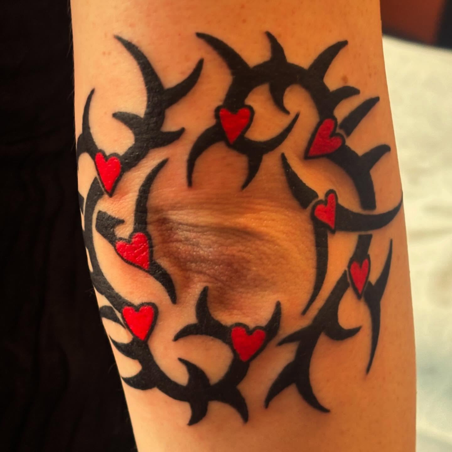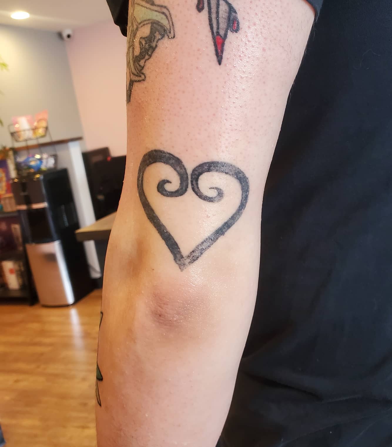 The tattoo features a heart shape with swirling ends, creating a unique and eye-catching appearance.