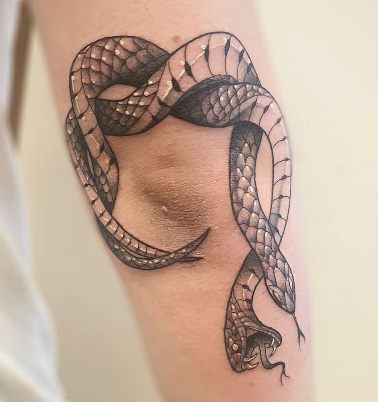 The tattoo features two snakes that are intricately entwined, creating a dynamic and flowing design around the elbow.