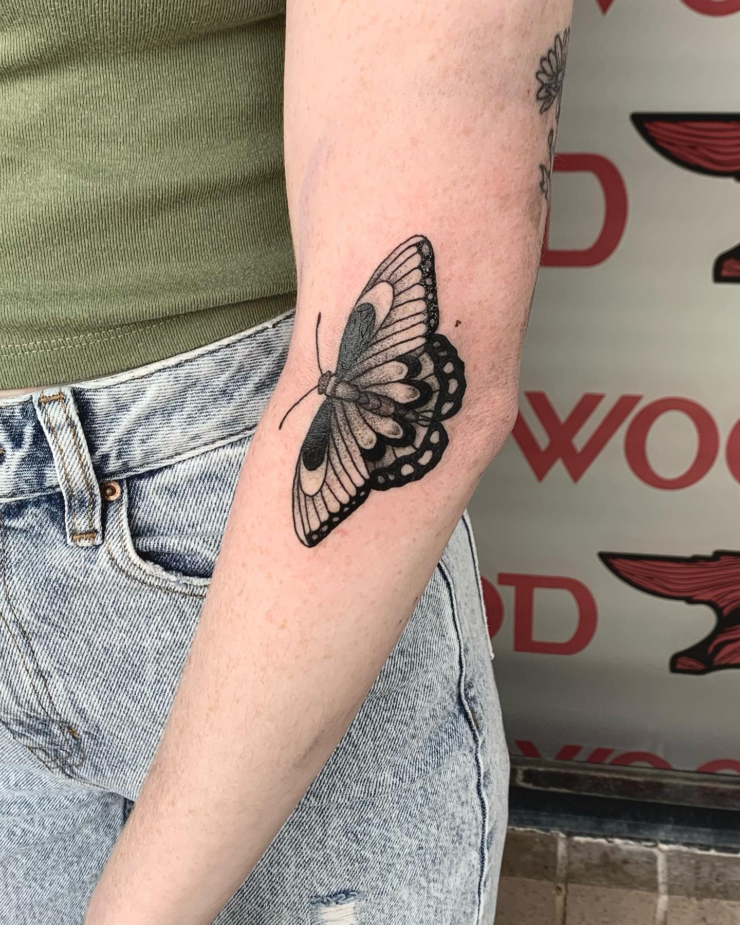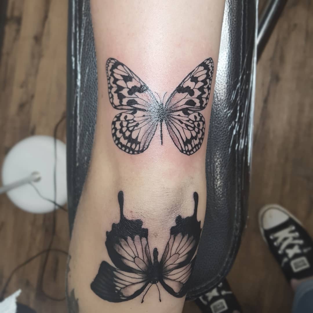 The tattoo features two butterflies, one with delicate line work and the other showcasing bold black shading.