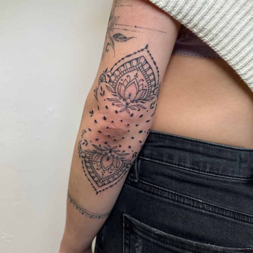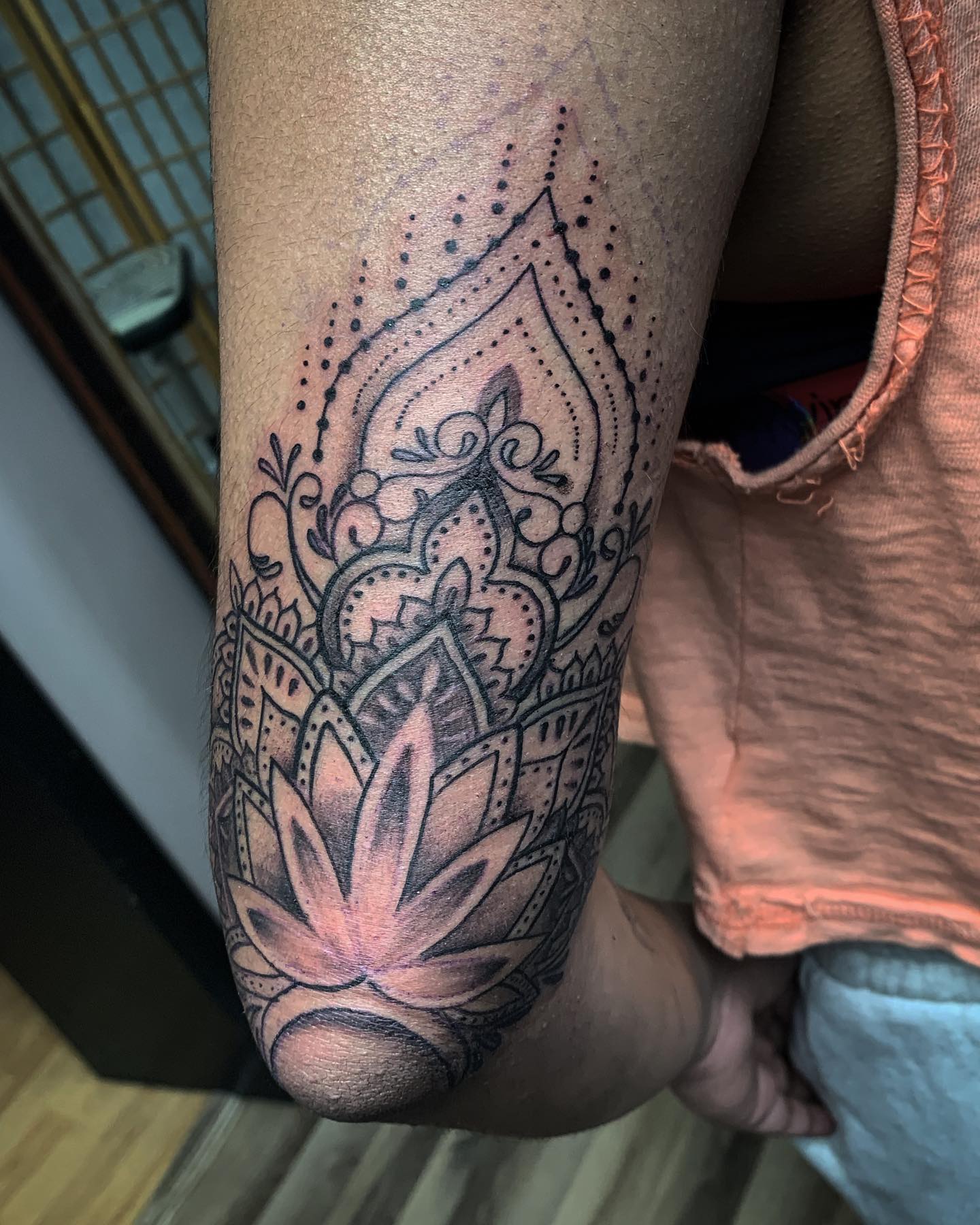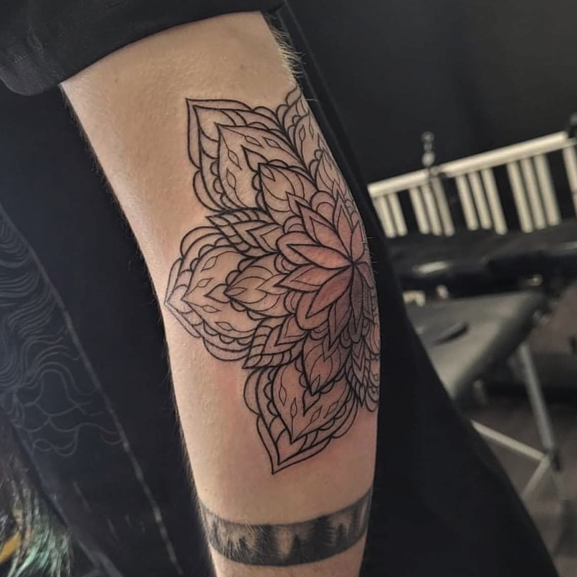 The tattoo features a blend of floral elements and intricate mandala patterns that wrap around the elbow area.