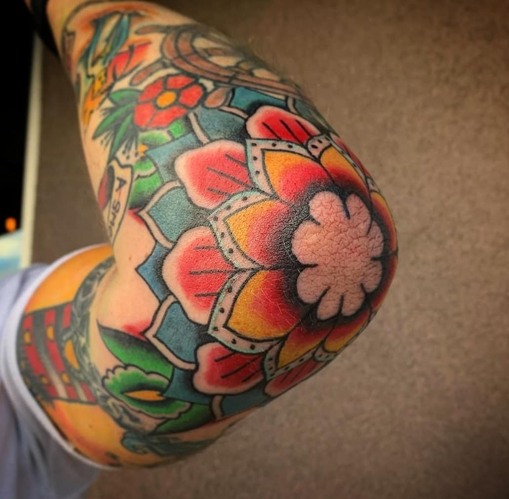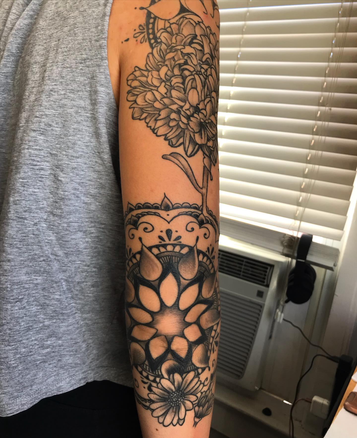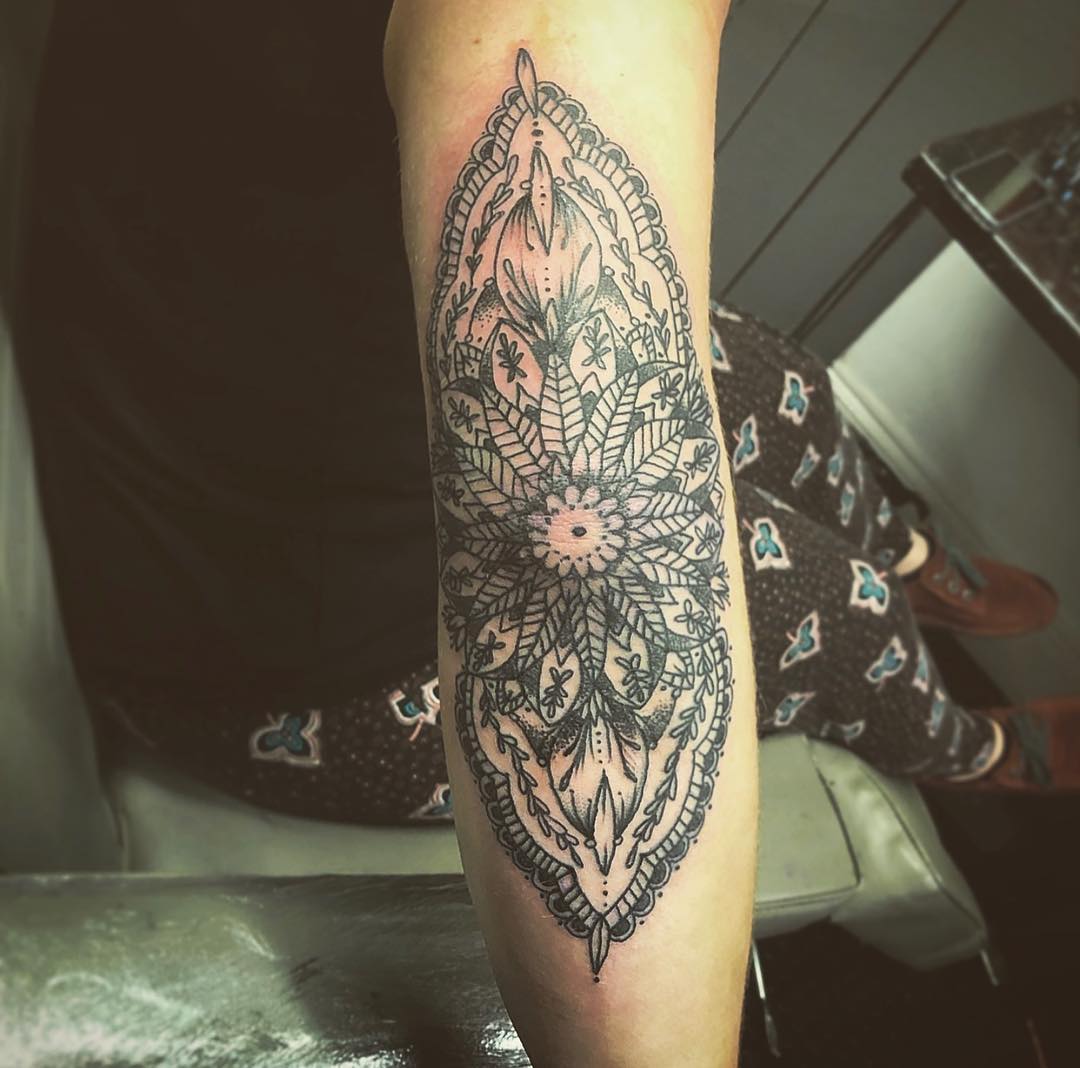 The tattoo features a blend of floral elements and intricate mandala patterns that wrap around the elbow area.