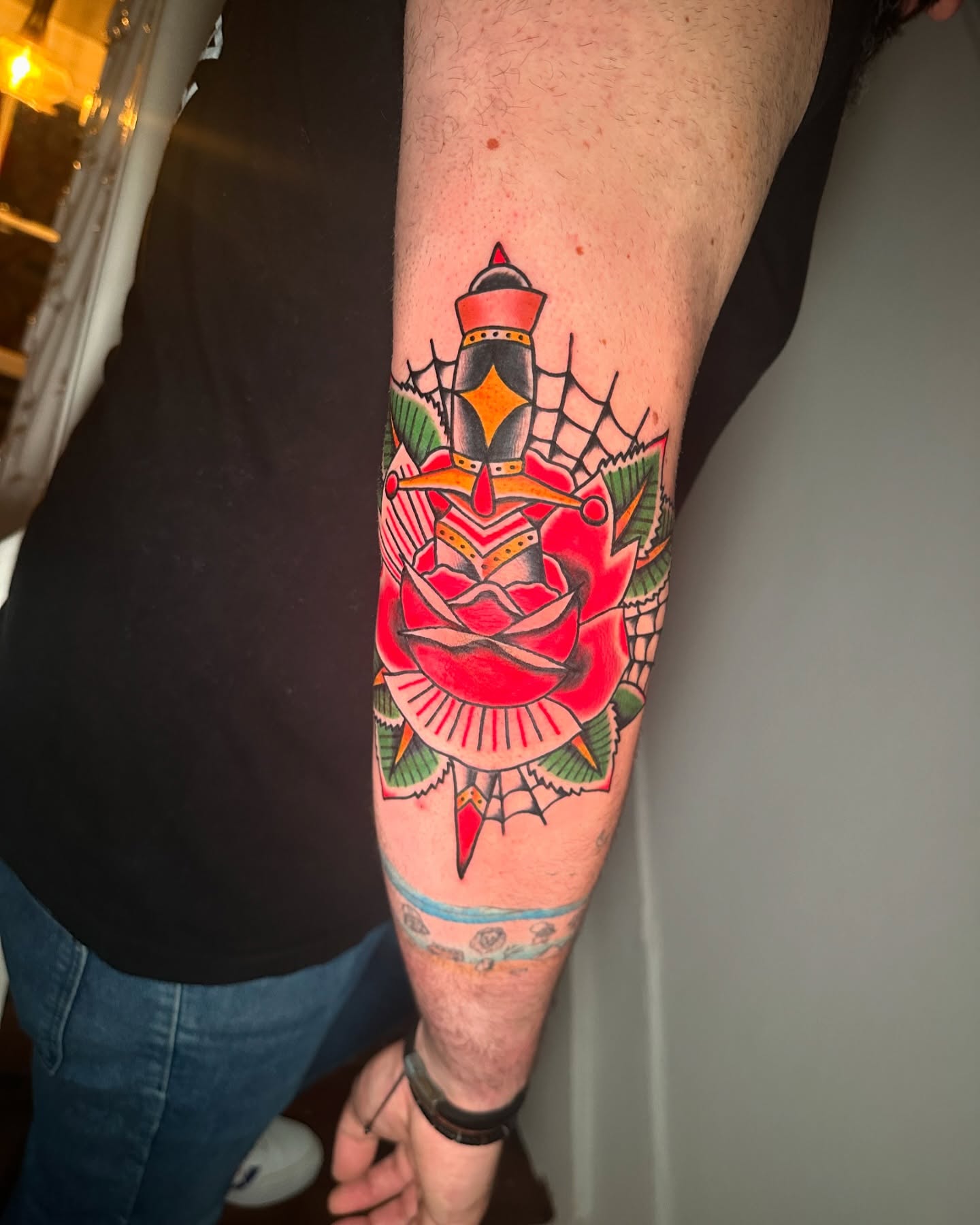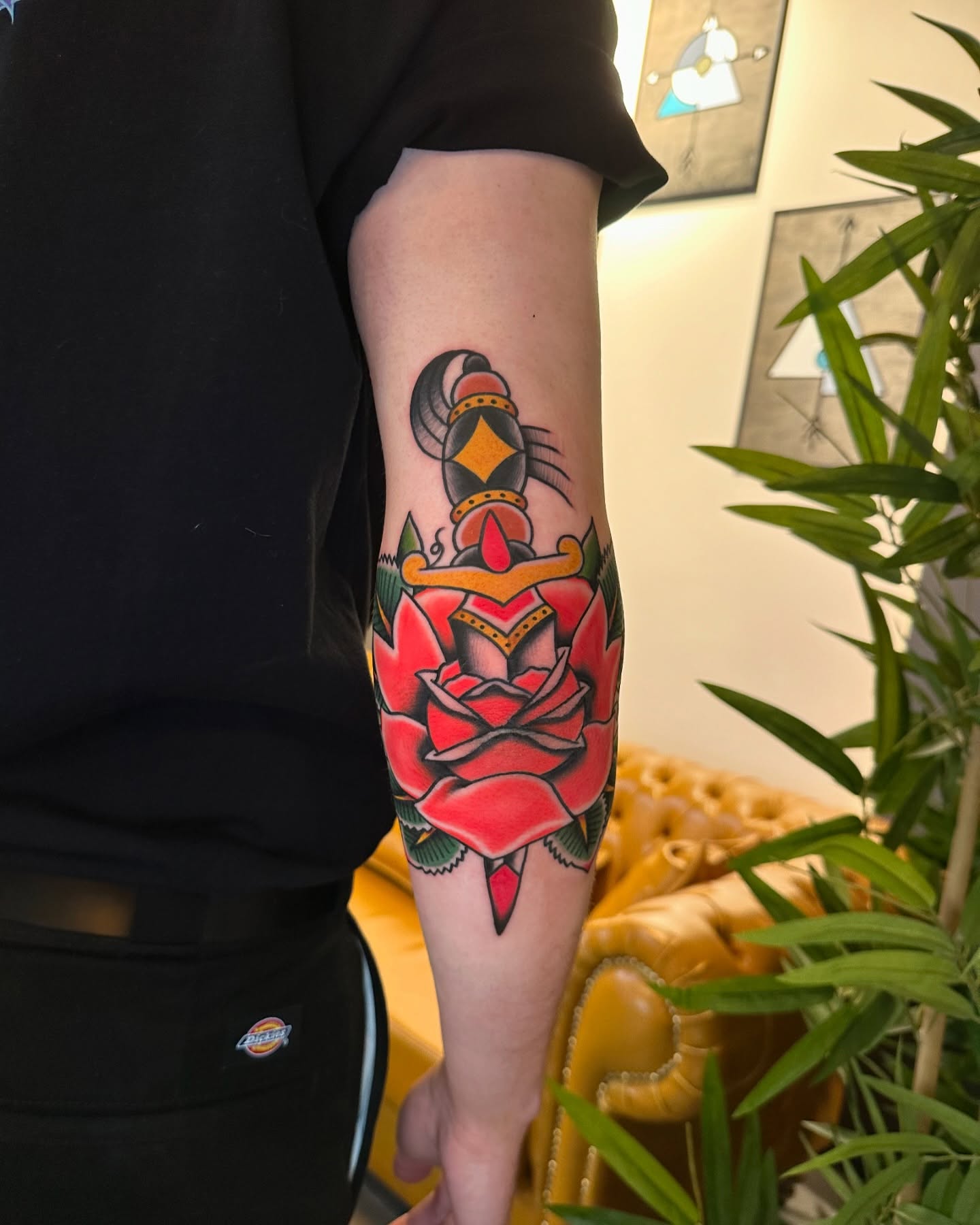 The tattoo features a striking red flower surrounded by intricate details, including a decorative sword and geometric shapes.